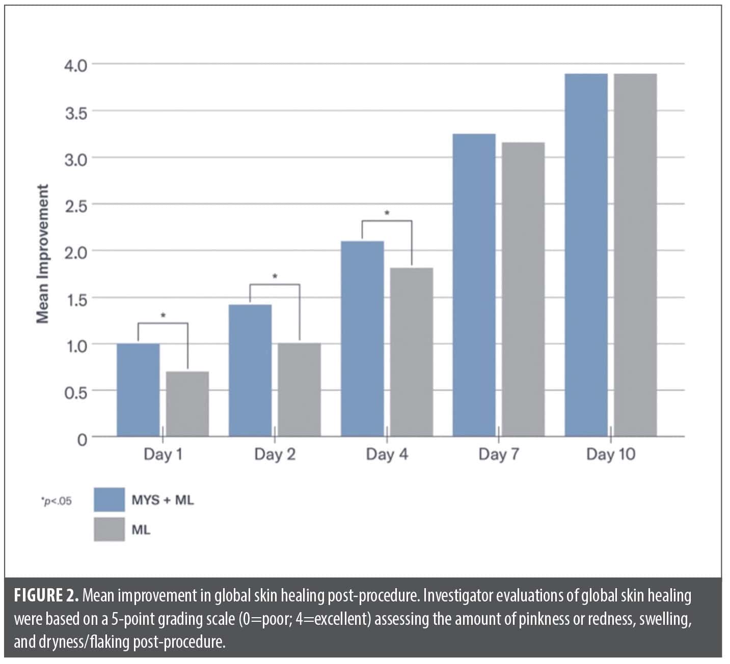 Post-procedure, significantly less edema was seen on the side of the face treated with MYS/ML vs. ML on Day 1 (–8% vs. +21%; p=0.01) and Day 2 (–22% vs. –5%; p=0.05). Significantly less dryness was demonstrated on the side of the face treated with MYS/ML vs. ML on Day 1 (1.67 vs. 2.0; p=0.05) and Day 2 (1.73 vs. 2.27; p=0.001). Earlier reductions occurred on Day 2 in erythema on the side of the face treated with MYS/ML vs. the side treated with ML (–29% and –17%, respectively). Significant improvements in global skin healing were demonstrated on the side of the face treated with MYS /ML vs. ML, post-procedure on Day 1 (p=0.04), and Days 2 and 4 (p=0.003) (Figures 2 and 3).