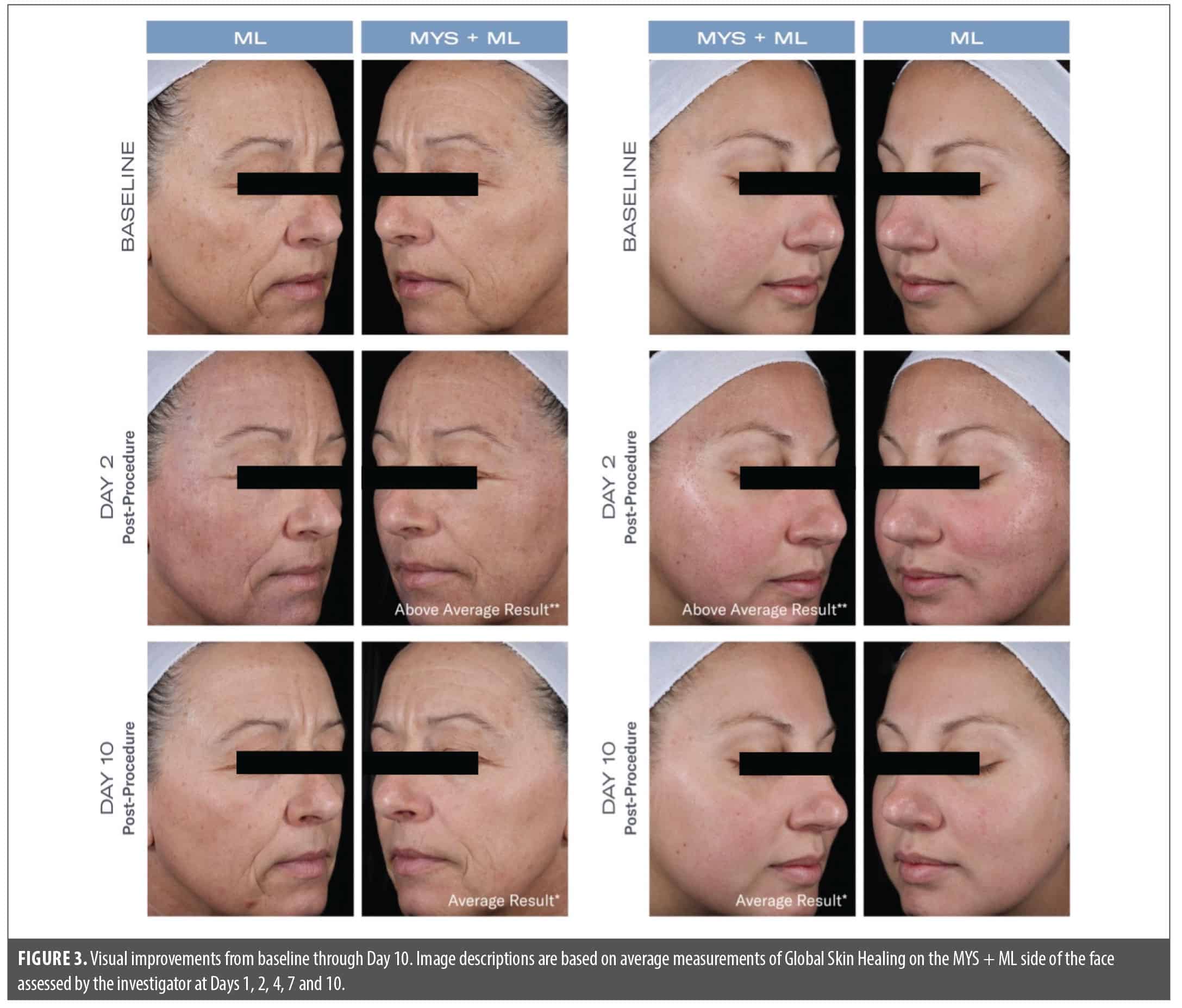 Additionally, 80% of participants reported that the skin on the side of their face to which MYS/ML was applied was brighter and more luminous on Day 4 post-procedure, with less flaking and peeling experienced on Day 7. The majority of participants reported greater satisfaction with their appearance and procedurally related side effects on the side of their face treated with MYS/ML at every timepoint through Day 10. Participants also noted that MYS absorbed quickly (pre-procedure), with less stinging (post-procedure), and felt hydrating.