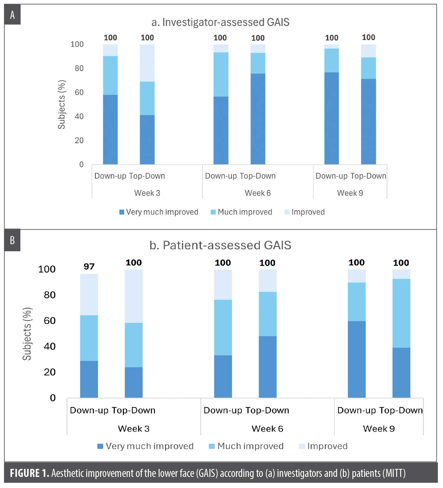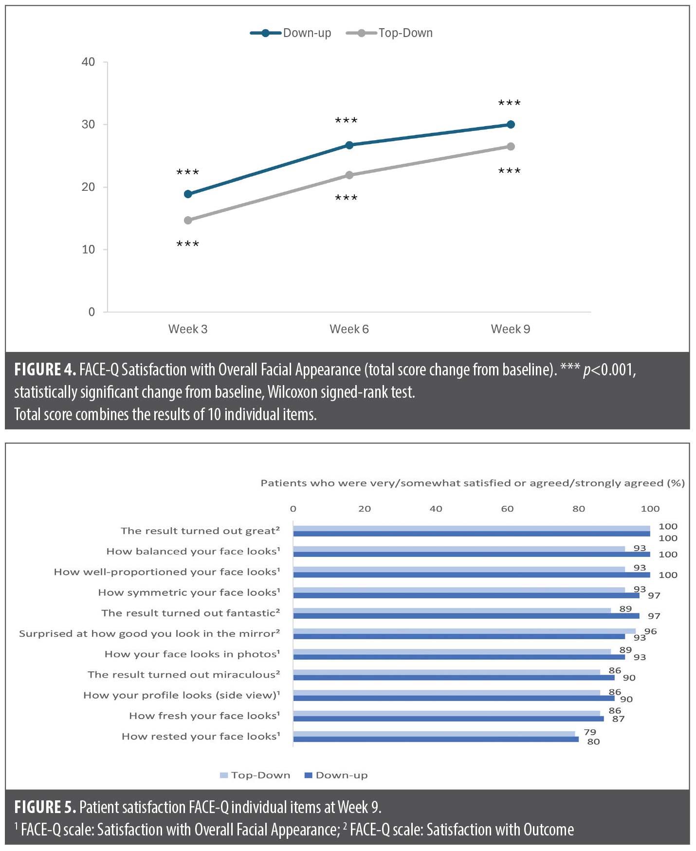 IPR-blinded assessment of photographs at Week 3, after the first treatment, showed a slight tendency in favor of the Down-up treatment for all variables assessed. The IPR reviewer reported a higher proportion of patients with improved facial harmony at Week 3 compared to baseline in the Down-up (74%) vs. Top-down (59%) group, as well as greater attractiveness (74% Down-up vs. 62% Top-down) and more masculinity/femininity (81% Down-up vs. 62% Top-down). At Weeks 6 and 9, there was no longer any tendency of a higher improvement in the Down-up group, as both groups showed similar, high rates of improvement from baseline of approximately 73-80% for all variables. The layman board blinded photo evaluations of attractiveness did not favor either group at any timepoint (data not shown).