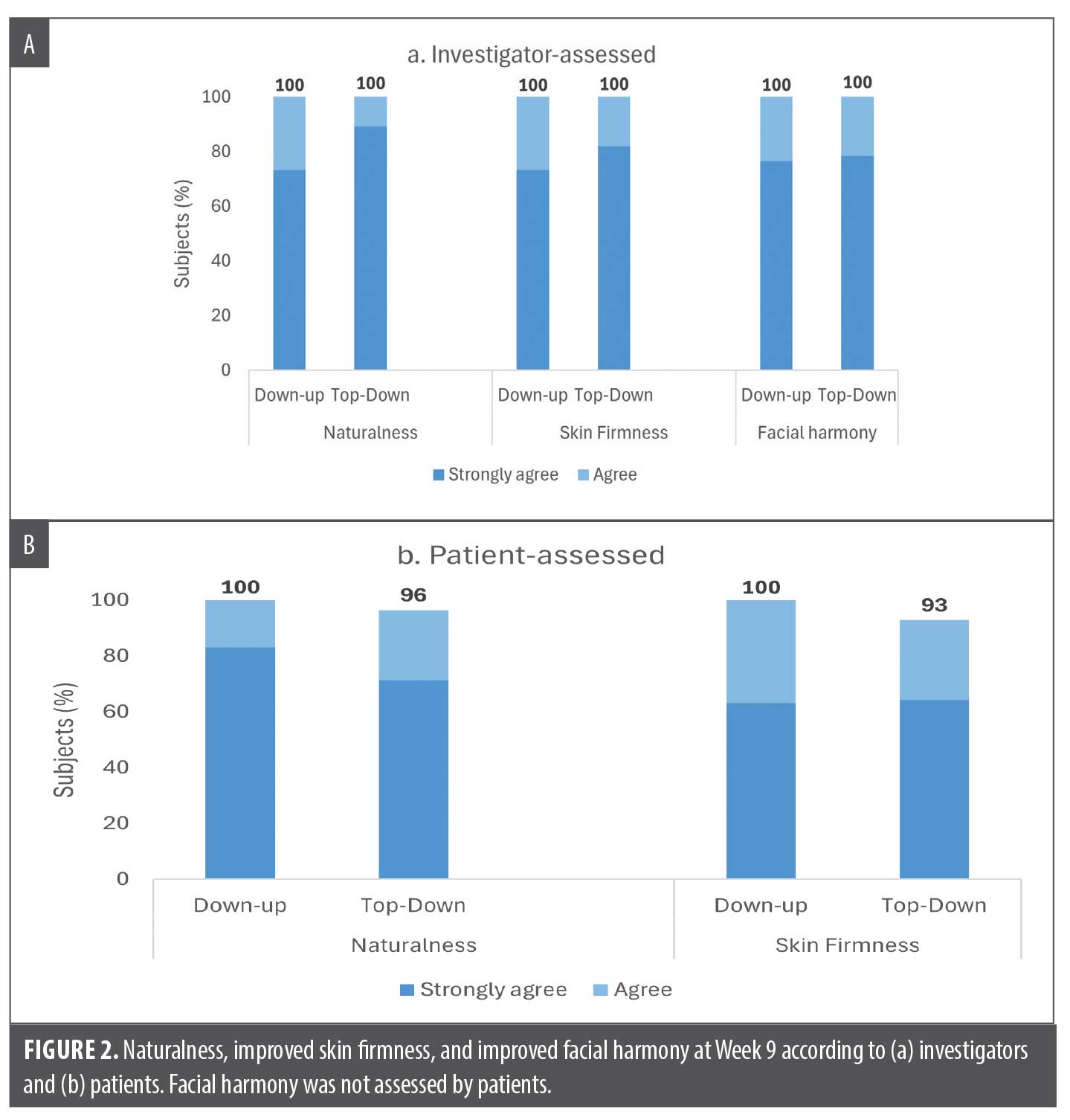 The naturalness of results and improvement in skin firmness around the chin were also rated as high throughout the study by both investigators and patients. At all timepoints for both groups, the majority of patients (at least 97% by investigators and at least 83% by the patients themselves) were assessed to have natural-looking results and firmer-looking skin around the chin after treatment. Facial harmony, assessed by investigators, was improved in 90% (Top-down) versus 100% (Down-up) at Week 3, in 100% of patients in both groups at Week 6, and also maintained in 100% of patients at Week 9. In summary, at Week 9 all patients (100%) in both treatment groups were assessed by the investigators to have natural-looking results, improved skin firmness, and improved facial harmony (Figure 2A). Likewise, at least 93% of patients from both groups reported themselves as having natural-looking results and improved skin firmness at Week 9 (Figure 2B).