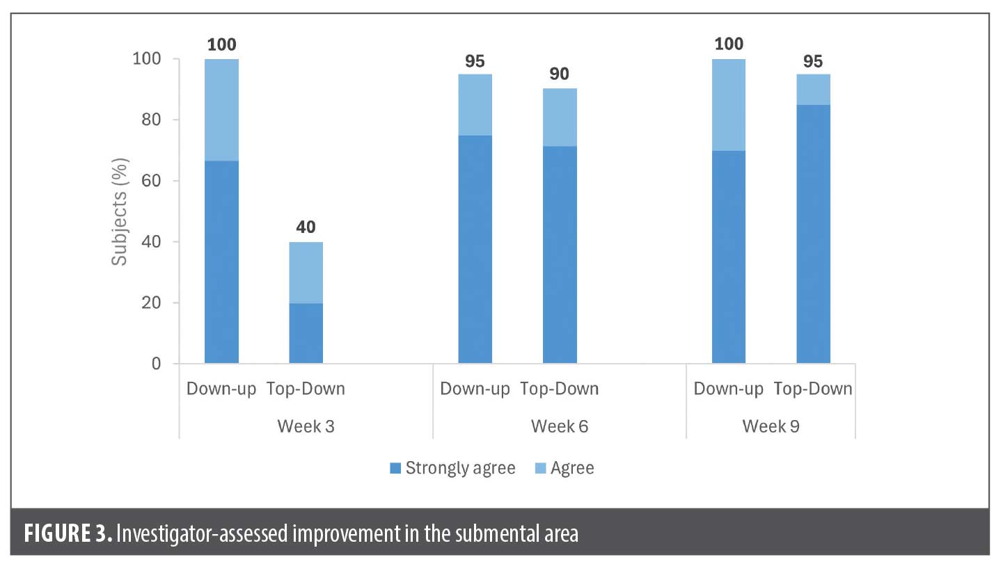 The submental area was assessed by investigators to need improvement at baseline in over two-thirds of patients in both groups (68%, 21 of 31 patients in Down-up group and 72%, 21 of 29 patients in Top-down group). Among these patients, the majority (at least 95%) in both groups achieved improvement at Week 9, and most of the improvement was reported at the visit immediately following chin treatment, ie, Week 3 for the Down-up group and Week 6 for the Top-down group (Figure 3).