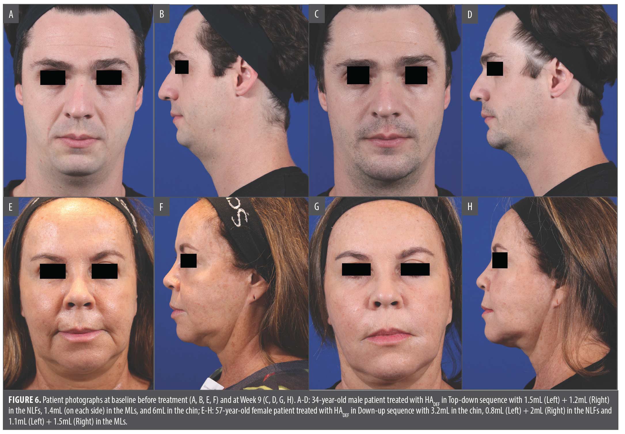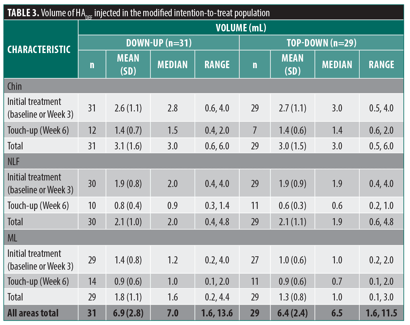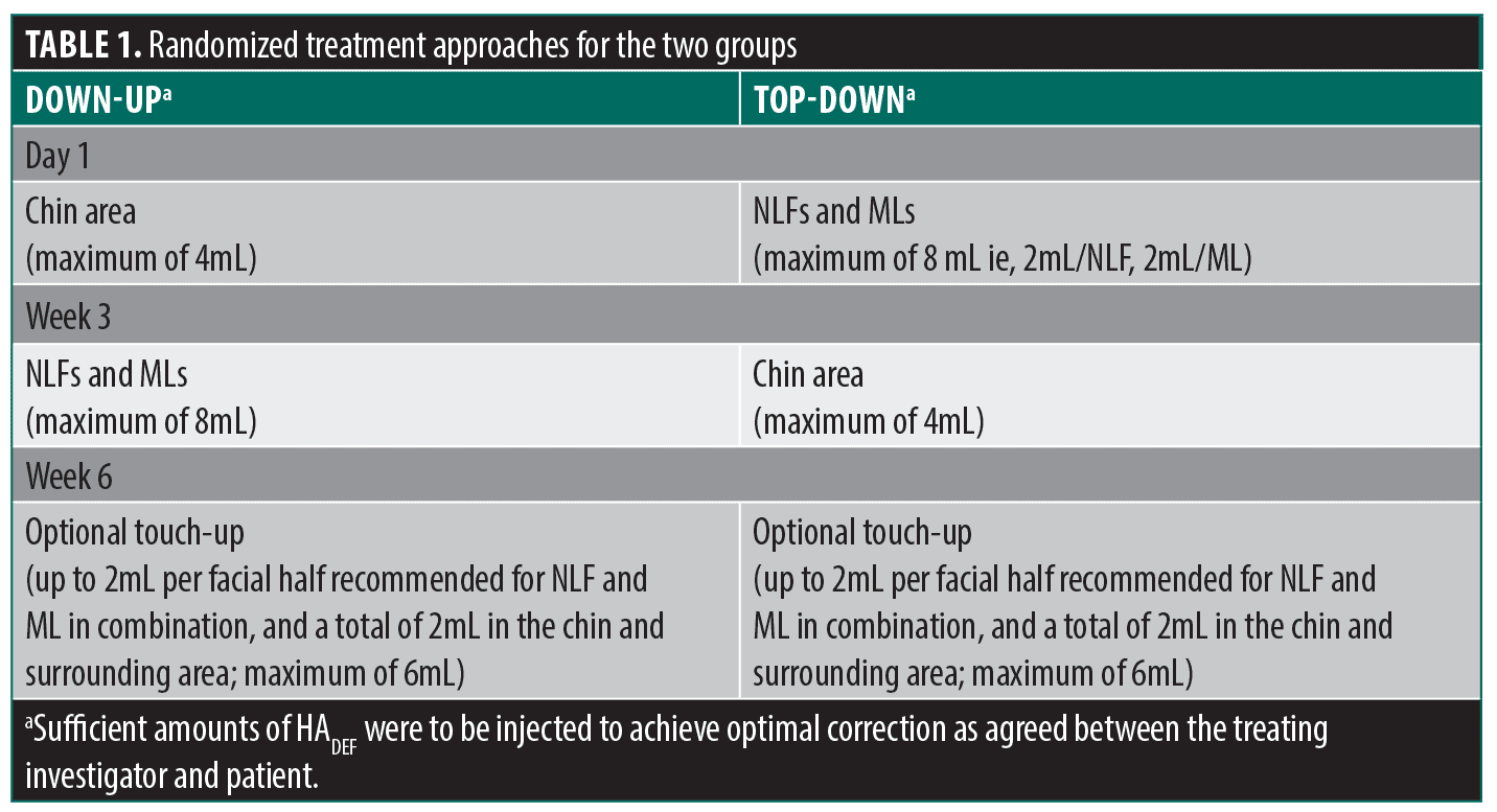 Treatment. Patients were randomized in a 1:1 ratio to one of two groups (Down-up or Top-down), both receiving treatment with HADEF (containing 20mg HA/mL and lidocaine hydrochloride 3mg/mL). In the Down-up group, injections were administered at Day 1 in the chin and at Week 3 in the NLFs and MLs, and in the Top-down group, injections were administered at Day 1 in the NLF and MLs, and at Week 3 in the chin. An optional touch-up in any of the treated areas that had not obtained optimal results was offered to both groups at Week 6 (Table 1). The injection technique used was at the discretion of the treating investigator, but the same predominant injection technique was to be used for all patients per site to limit variability. Injection depth could vary based on the patient’s treatment needs.