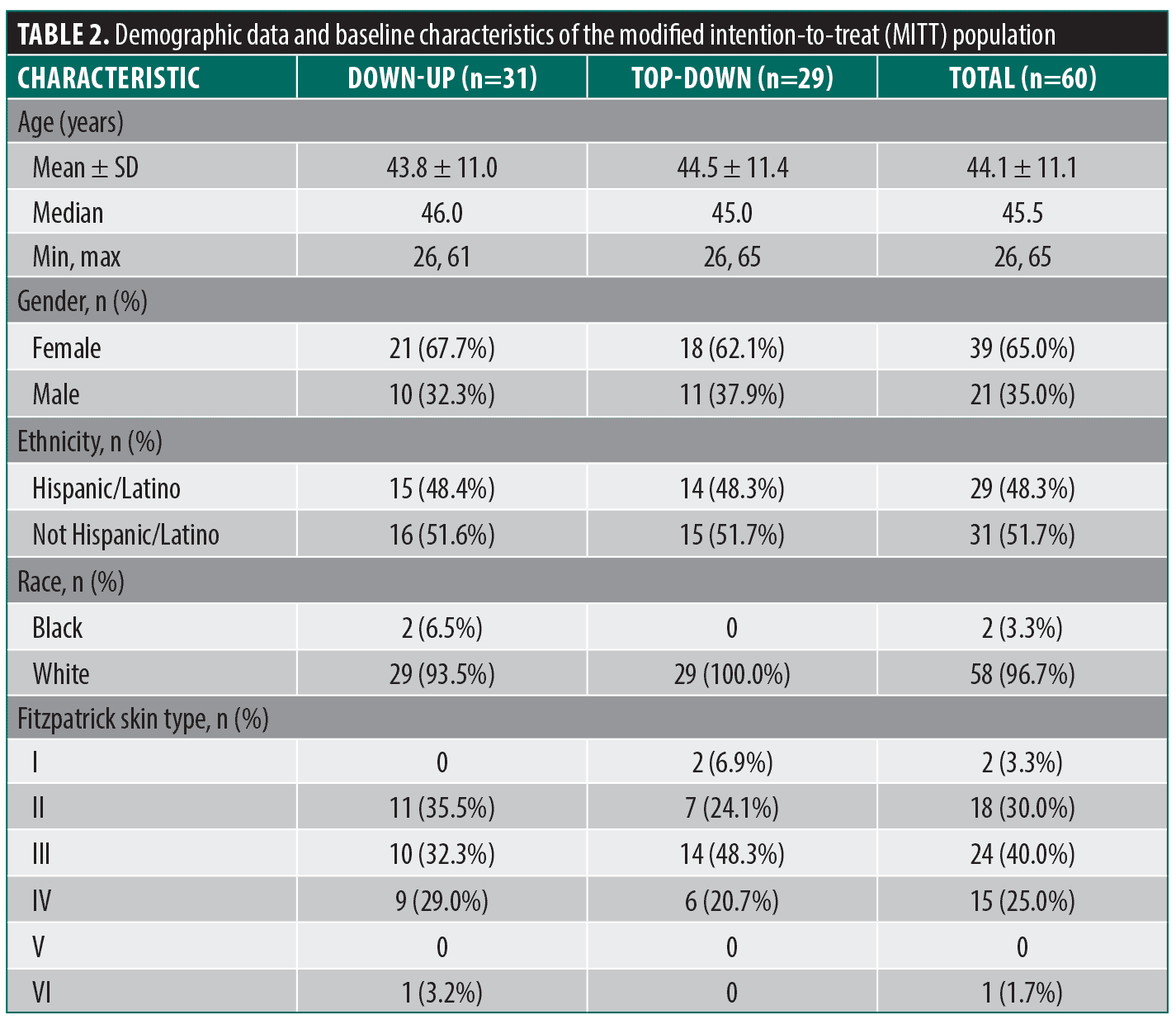 Demographic data for the MITT population are presented in Table 2. Overall, patients had an average age of 44 years, 65% were female, 95% had Fitzpatrick skin type II-IV, and approximately 48% were of Hispanic/Latino ethnicity.