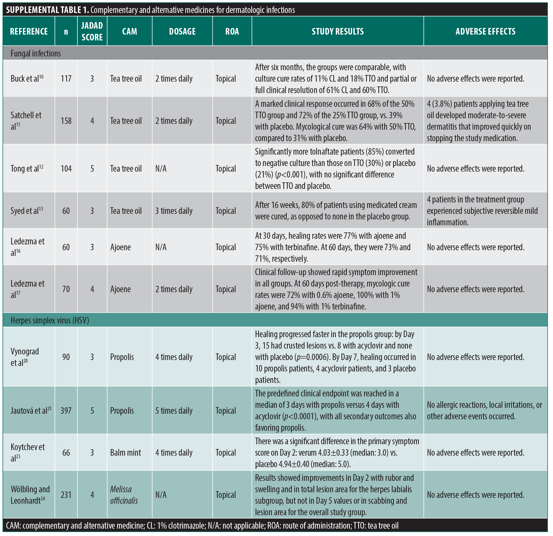 This review offers an overview of CAM therapies investigated for dermatologic infectious diseases, emphasizing viral and fungal infections and detailing only those evaluated in randomized controlled trials (RCTs) or other significant clinical studies. Where applicable, the quality of evidence for a CAM therapy will be assessed using the Jadad Scale to guide practitioners on potential efficacy (Table 1).9 Heightened scrutiny should help differentiate between scientifically proven CAM agents and those merely claimed effective by advocates.
