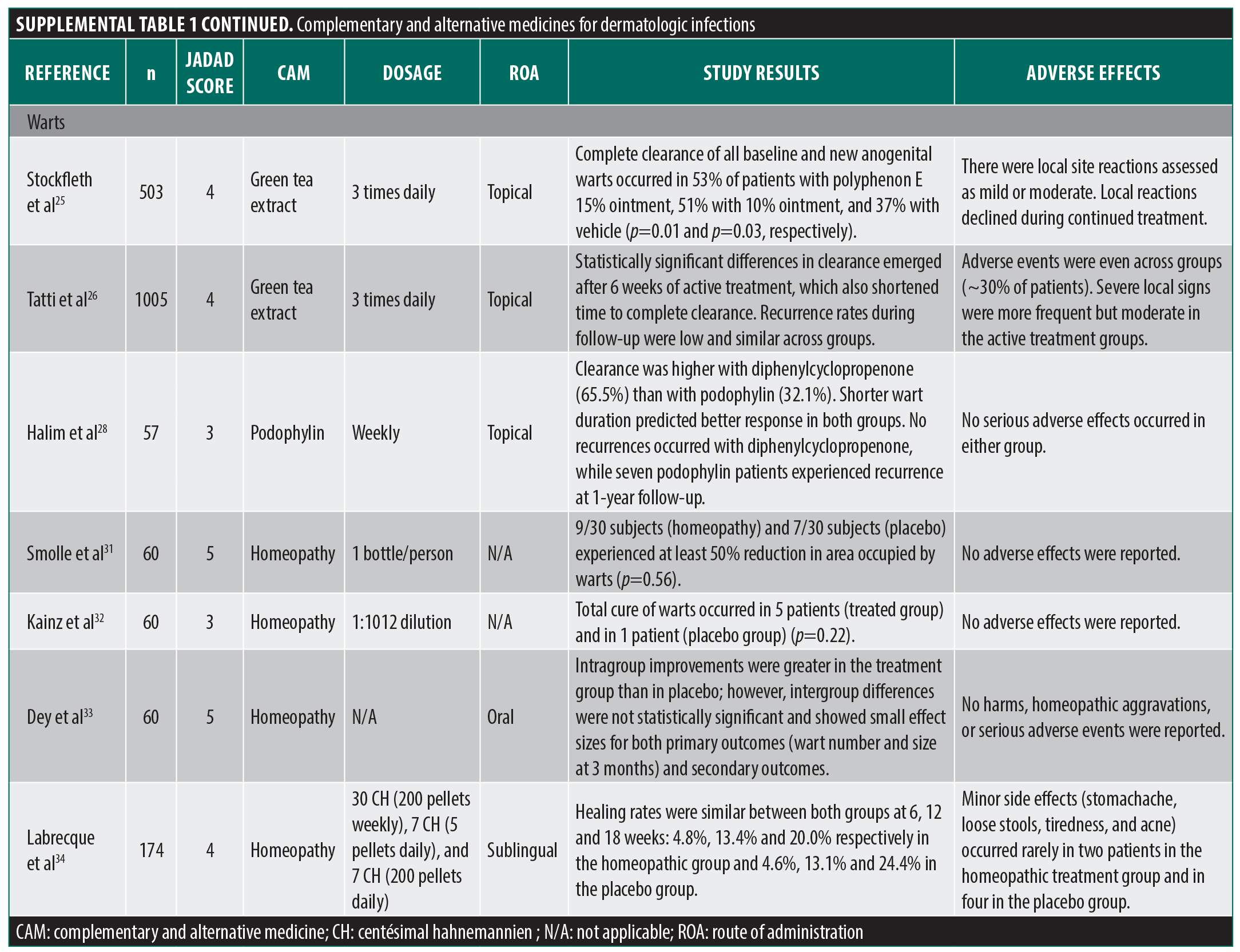 Several CAMs have been suggested as treatments for condyloma and verruca warts, including various herbal agents, green tea extract (GTE), homeopathy, and hypnosis. Two recent reports from the same group have examined the effectiveness of a commercial green tea extract cream (polyphenon E) in large RCTs for the treatment of genital and perianal warts.25,26 The investigators found increased wart clearance rates in both groups using the treatment ointment at 10% and 15% concentrations compared to the control (>50% vs. ~35% for vehicle only). Secondary outcomes showed significant improvement in median wart number and coverage area,25 significantly shorter time to complete clearance, and similar recurrence rates.26 Overall, these studies were well designed and properly performed; however, while the studies were labeled double-blind, no information was provided on blinding procedures and the authors were paid employees or consultants of the treatment cream manufacturer. Both of these issues may be deserving of heightened scrutiny given that the primary outcome was subjective clearance. Furthermore, the more objective outcomes were less impressive. While a difference was seen in median wart area and count (unsurprising, as they were reported as zero in treatment groups), no difference was seen in the average of these parameters, with averages perhaps being of greater relevance because this parameter would factor in a variability in response with standard deviations. Despite this, the average Jadad score for both studies is 4, due to risk of bias (publication bias, industry sponsor) and design flaw (blinding, outcome measures). It is also worth noting that unlike many other GTE studies, treatment groups in these studies did see a significantly higher incidence of adverse local skin reactions including erythema, edema, and erosion (no difference in systemic adverse events).