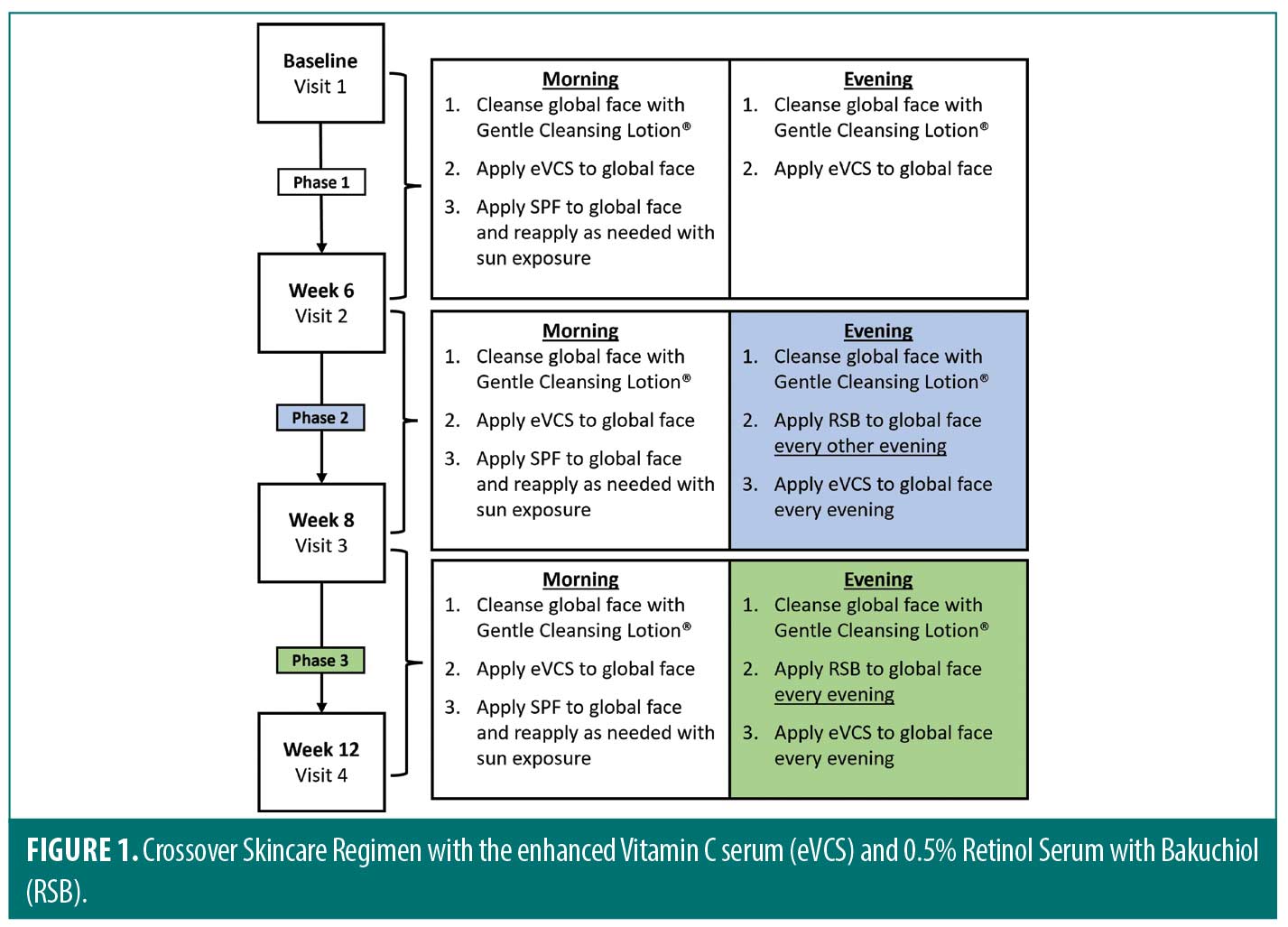 Subjects underwent a two-week washout period refraining from use of topical retinoid, vitamin C, or skin-lightening products. The cross-over skin care regimen (Figure 1) consisted of three phases. Phase 1 included the period between baseline and Week 6, Phase 2 was between Week 6 and Week 8, and Phase 3 was between Week 8 and Week 12. At baseline, subjects were given pre-weighed Gentle Cleansing Lotion (Revision Skincare®, Irving, Texas), eVCS (Revision Skincare®, Irving, Texas), and Aveeno Positively Mineral Sensitive Skin SPF 40+ (Johnson & Johnson, New Brunswick, New Jersey). During Phase 1, subjects cleansed their global face with the Gentle Cleansing Lotion morning and evening, applied the eVCS to the global face morning and evening, and applied the SPF 40 to the global face in the morning. At Week 6, the start of Phase 2, subjects were given pre-weighed RSB (Revision Skincare®, Irving, Texas) to be incorporated into their skincare regimen. During Phase 2, subjects were instructed to cleanse the entire face, apply the eVCS in the morning and evening, and apply the RSB to the global face (avoiding eye area) every other evening up to Week 8. At Week 8, Phase 3, subjects continued to follow the skincare regimen with the only modification of increased RSB application to every evening up to Week 12. Subjects were instructed to protect the treated areas from extended sun exposure during the study by reapplying sunscreen and wearing protective clothing with extended sun exposure.