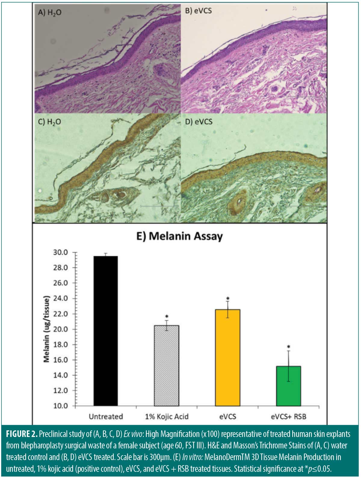 In vitro. The efficacy in the eVCS and eVCS and RSB blend to reduce melanin content on MatTek MelanoDerm™ tissues were determined. While the eVCS significantly reduced melanin content when compared to the untreated tissues (*p≤0.05), the eVCS + RSB blend provided further melanin content reduction, indicating a synergistic effect associated among eVCS and RSB combination (*p≤0.05) (Figure 2E).