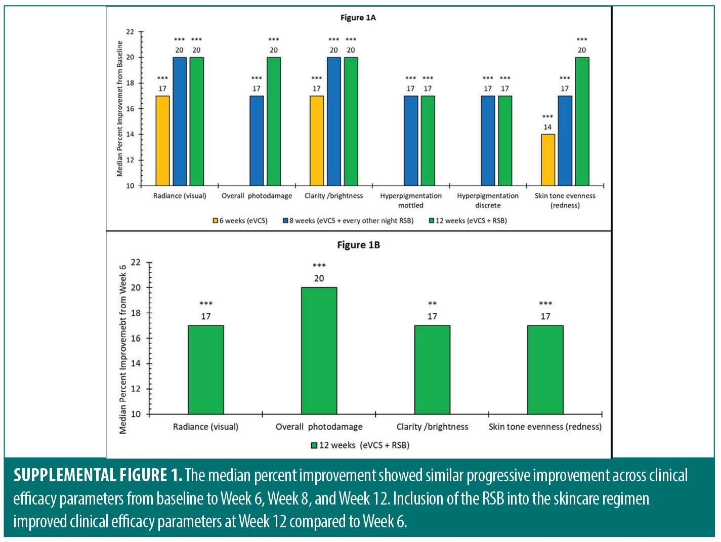 Supplementary material. Improvements in clinical efficacy parameters were also evaluated by nonparametric statistics in which the median rather than the mean percent improvement was calculated. The results are shown in Supplementary Figure 1. The median percent improvement showed similar progressive improvement across clinical efficacy parameters from baseline to Week 6, Week 8, and Week 12. Inclusion of the RSB into the skincare regimen improved clinical efficacy parameters at Week 12 compared to Week 6.