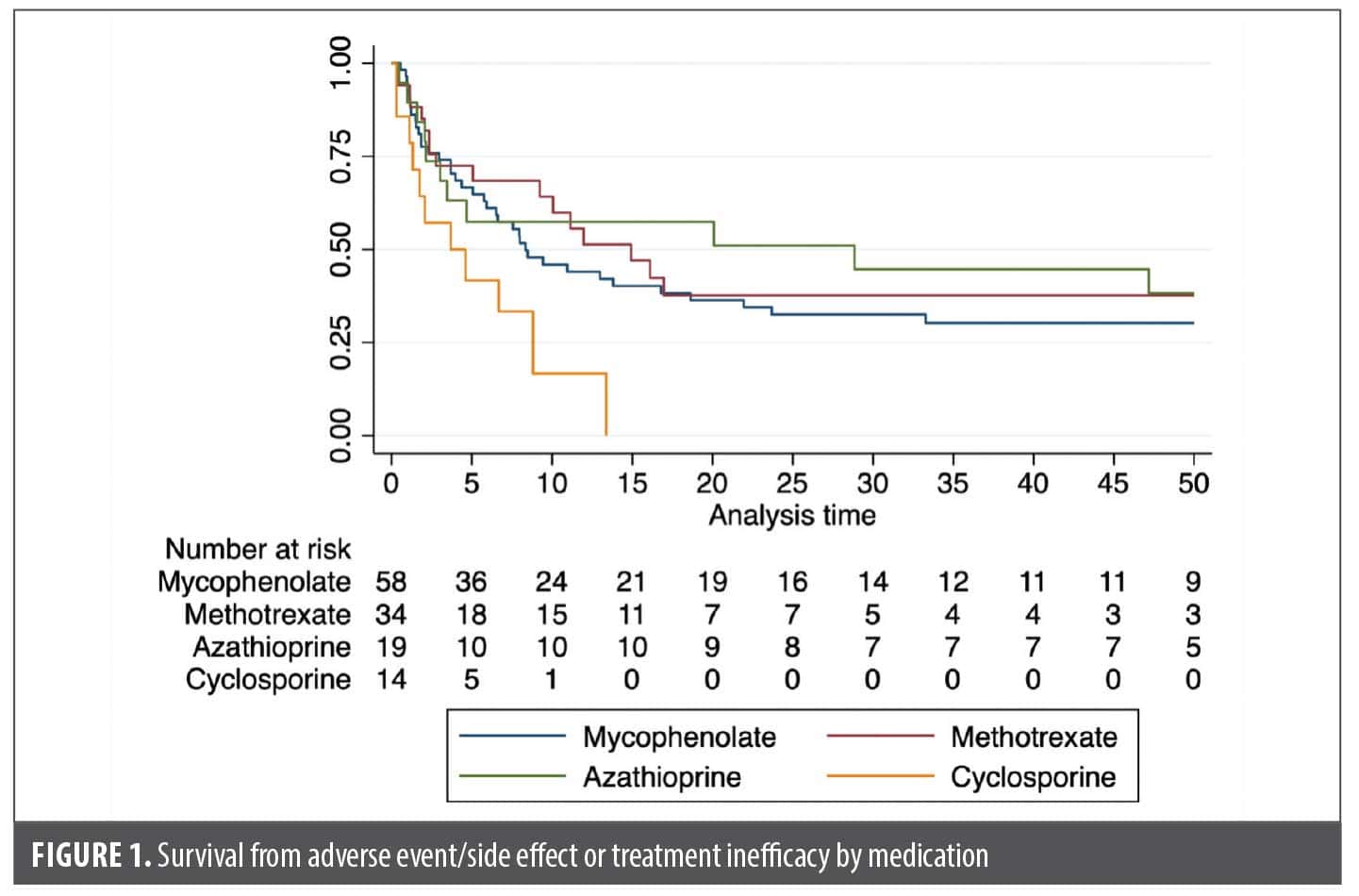 We included patients seen at the University of Utah from January 1, 2010 to April 1, 2024 with a dermatologist-verified OLP diagnosis treated with methotrexate (MTX), mycophenolate mofetil (MMF), azathioprine (AZA), or cyclosporine (CsA). OLP diagnosis required OLP diagnosis over at least two visits and clinically congruent appearance. While we did not require histologic confirmation, most cases had confirmatory histology (68 of 91 [74.7%]). We excluded patients with concomitant systemic treatments (besides hydroxychloroquine/short-term oral corticosteroid), undocumented reason for treatment discontinuation, or multiple trials of the same immunosuppressant (only the first trial was included). In patients who used multiple unique immunosuppressants at nonoverlapping time points (eg, MTX that was transitioned to MMF due to lack of efficacy), each trial was considered individually. Descriptive statistics included medians/interquartile ranges (IQR) and counts or percentages. Group comparisons were made using Kruskal-Wallis (continuous variables) and chi-square test (categorical variables). Time to medication discontinuation was evaluated using Kaplan-Meier estimator, and Cox proportional hazards regression was used to compare the risk of discontinuing a medication between medications and across different demographic factors.8,9 Our primary outcome was hazard of medication discontinuation due to adverse event or medication failure. Secondary analyses included an age- and sex-adjusted model for the primary outcome, individual evaluations of failure due to adverse events, medication failure, and medication success (ie, patient remission). Analyses were performed across medication groups and the overall cohort, as well as by individual medications. All analyses were performed in Stata v17.1, StataCorp, and p<0.05 was considered significant.
