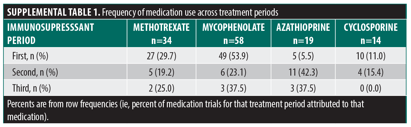 This study has important limitations. First, all cases came from a single institution with limited racial or ethnic representation, limiting generalizability. There is also a potential for misclassification, given that 25% of cases did not have a biopsy available. Furthermore, most cases were severe with erosive subtype disease, which may alter drug survival. For example, with more severe erosive disease, smaller improvements may be considered grounds for discontinuation, whereas in more moderate disease, these improvements might be more acceptable and the medication may be more likely to be continued. We found no evidence for differences in drug survival by erosivity, but this confounding may remain, and generalizability is limited. The order of immunosuppressant usage may affect subsequent treatment periods. We attempted to account for this, but it is possible that other treatments that were not reported (ie, used by a referring physician or prior to our current electronic medical record time period). Lastly, direct comparisons between medications are limited by the retrospective nature and likely confounding by indication.