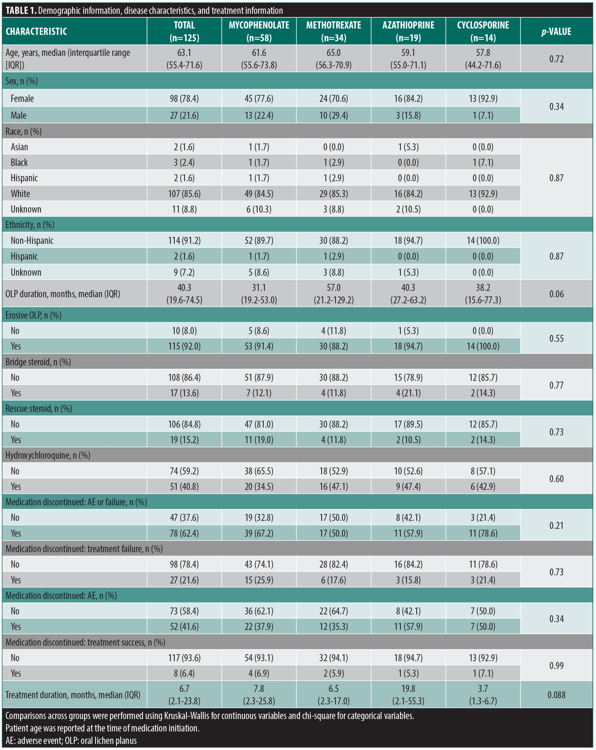 Oral lichen planus (OLP) is a mucocutaneous inflammatory disease thought to be driven by a T-cell immune response, potentially to unknown antigens.1 Approximately 0.5% to 2% of the global population is affected, and there has been an associated increased risk of oral squamous cell carcinoma, particularly among more severe inflammatory or ulcerative subgroups.2,3 OLP is highly morbid, with one qualitative study noting that 69% of patients experienced significant impact on their activities of daily living.4 Although first-line treatment involves the use of topical corticosteroids, the evidence for its efficacy is somewhat inconclusive, and our clinical experience suggests that many patients with moderate-to-severe OLP require additional systemic therapy. A Cochrane systematic review found no significant difference in clinical resolution between topical corticosteroids and placebo, though pain was more likely to be resolved using topical corticosteroids.5 If topical therapies prove insufficient, severe disease may require treatment with immunosuppressive medications such as mycophenolate, methotrexate, azathioprine, and cyclosporine.6 Currently, immunosuppressive medication durability in OLP is unknown. Medication durability can provide insight into tolerability and efficacy.7 We also assessed for factors associated with discontinuation of treatment in the overall group and medication subgroups.