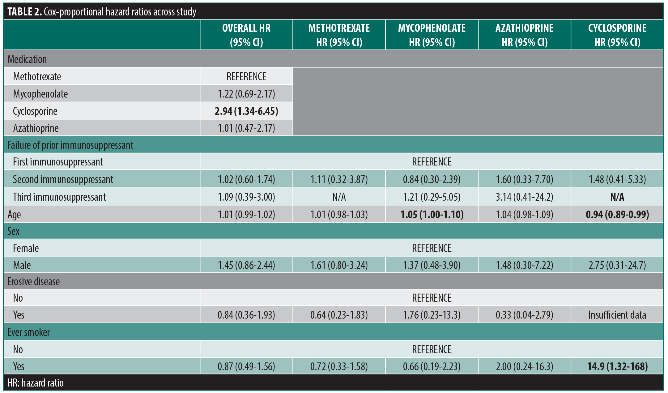 When analyses were stratified by individual medications, treatment discontinuation due to treatment failure occurred more often in men (HR: 1.91; 95% CI: 1.05-3.45) but otherwise estimates were similar. Corticosteroid rescue was identified 19 times. We identified no differences in steroid rescues across medications nor by patient and disease demographics. Discontinuation due to treatment success occurred in 8 treatment periods. We found no evidence for differences in chance of success across medication groups nor demographic factors.