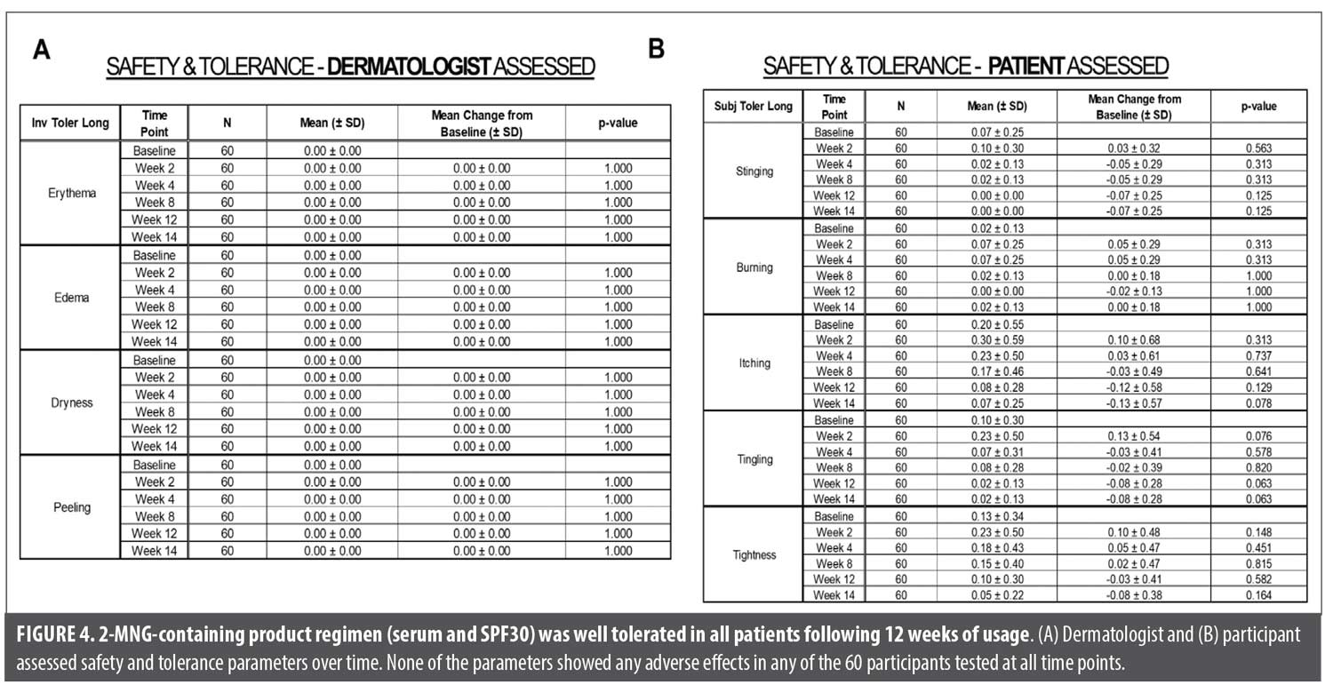 Safety and tolerance assessments in women with skin of color. Figures 4A and 4B show the safety and tolerance assessments, performed by board-certified dermatologist and clinical participants for the following: erythema, edema, dryness and peeling. No adverse effects in any of the 60 participants evaluated at all time points were observed throughout study. Overall, the 2-MNG-containing serum and sunscreen SPF30 regimen was well tolerated in women with SOC after 12 weeks of usage under study conditions.