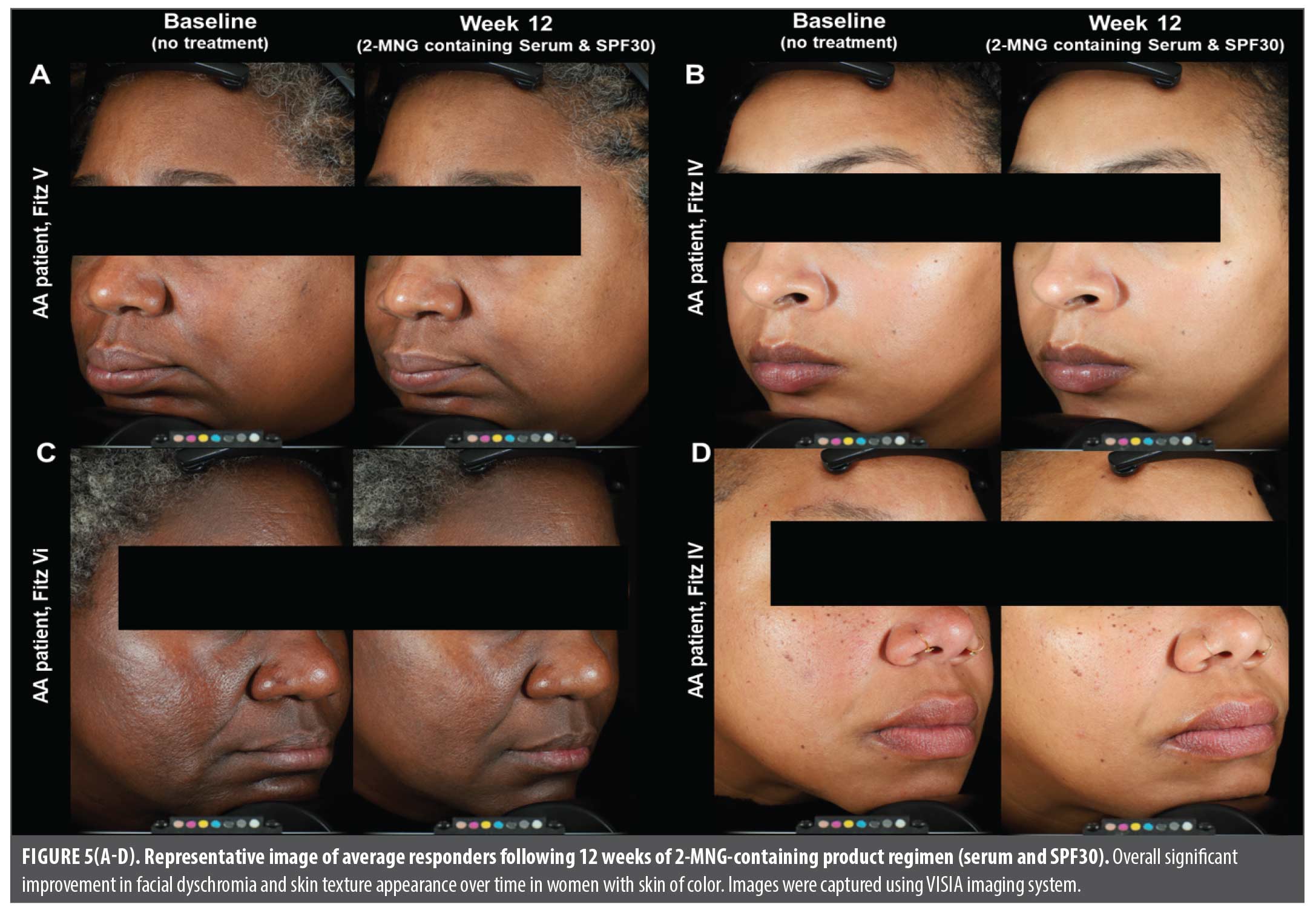 Clinical images of women with skin of color following 2-MNG-containing skincare regimen. Representative VISIA-CR standard clinical images of 4 average responders are shown in Figure 5. Overall significant improvement in facial dyschromia and skin texture, plus quality can be observed following 12 weeks of treatment with 2-MNG-containing serum and sunscreen SPF30 regimen.