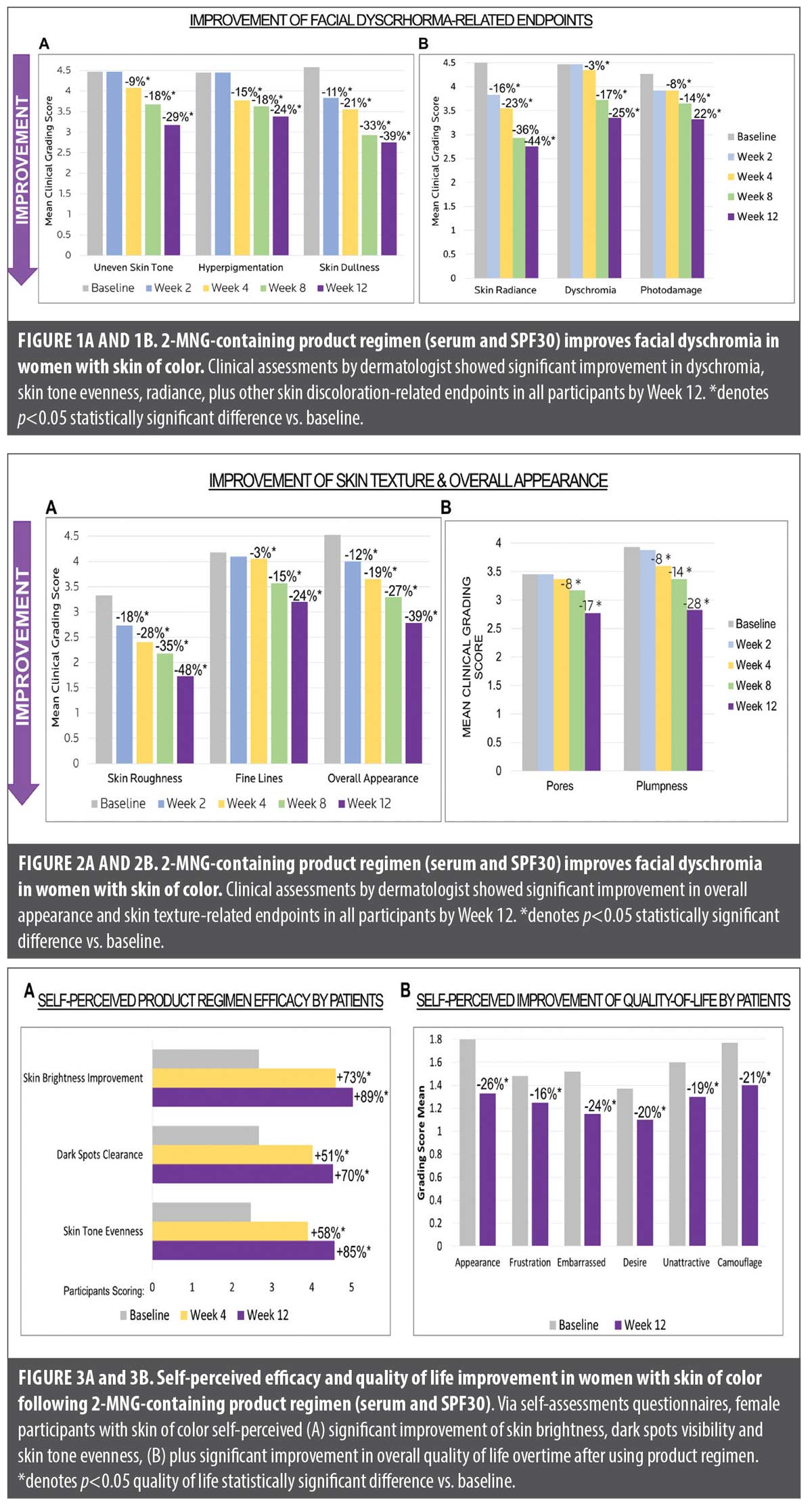 Improvement of facial dyschromia in women with skin of color. Figures 1A and 1B demonstrate the clinical assessments by a board-certified dermatologist of facial dyschromia-related skin attributes overtime, following 12 weeks of treatment with 2-MNG-containing skincare regimen in female participants with skin of color.