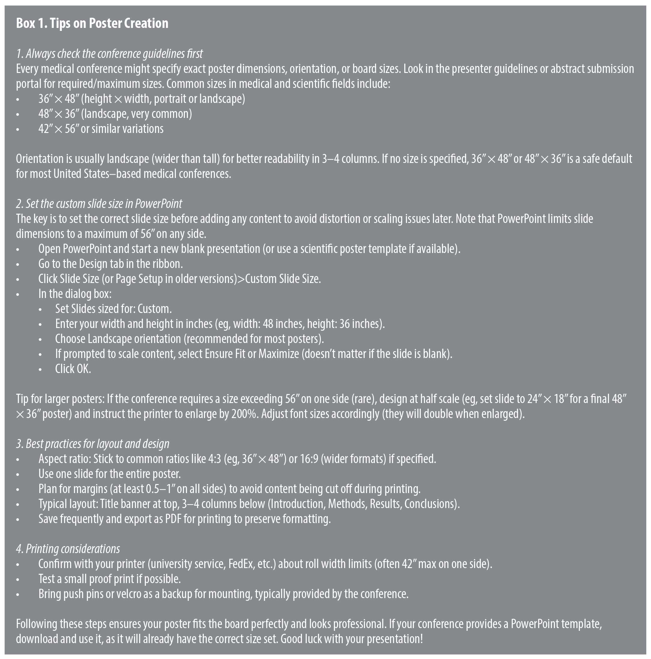 Most dermatology conferences use a horizontal poster board for physical posters, and the standard layout is a 3-column design. The title and author block stretch across the top. Directly underneath, the left column contains the background and case narrative, formatted in short paragraphs or structured bullets. The center column is commonly used for visuals—clinical photos, dermoscopy, histopathology, or graphs. The right column contains the discussion, key takeaways, references, and acknowledgments. Adequate white space separates sections to allow the reader’s eye to flow naturally from left to right (Figure 1). For ePosters, adapt this to a single-page scrollable PDF or interactive slide, where columns might stack vertically for better mobile viewing. Conferences might mandate landscape orientation for physical posters but allow portrait for digital ones to fit screens. See Box 1 for tips on poster creation.
