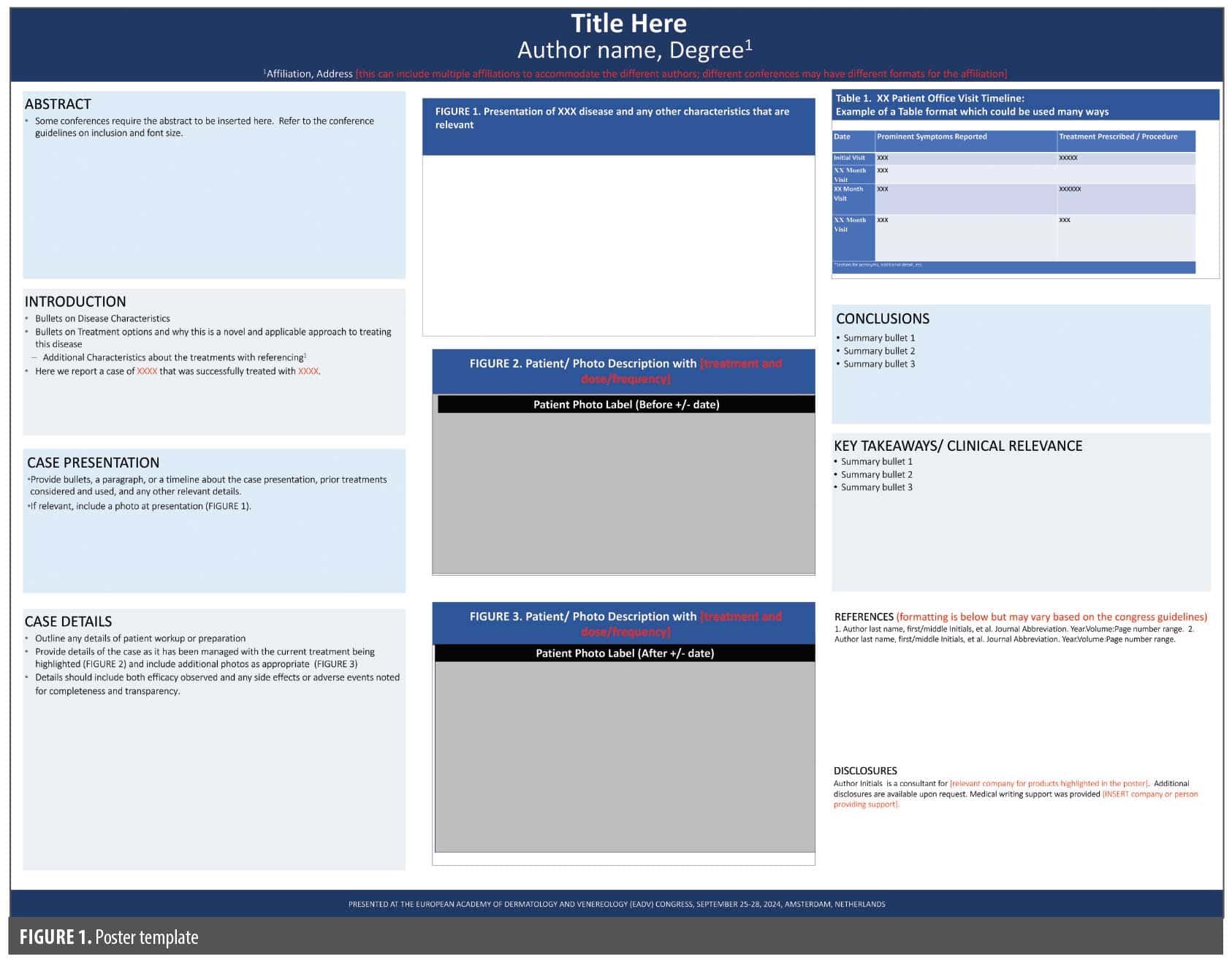 - Because dermatology is such a visual specialty, formatting matters as much as content. Posters should be clean, readable, and image-forward. A template for a landscape version to get you started is provided.