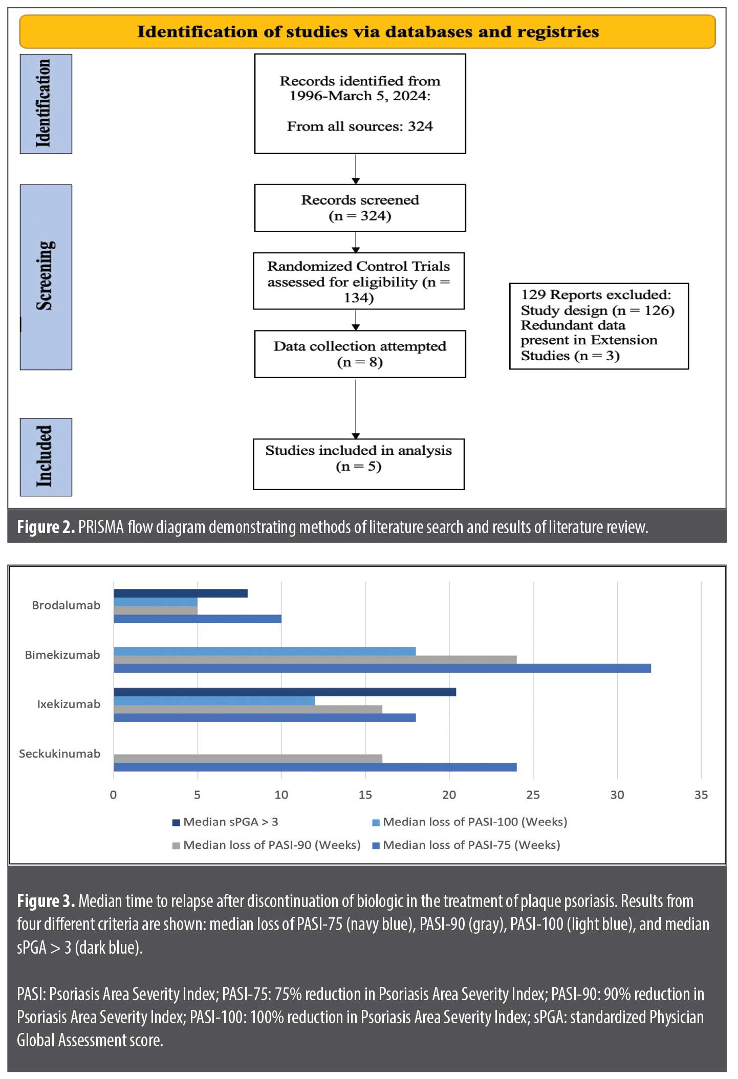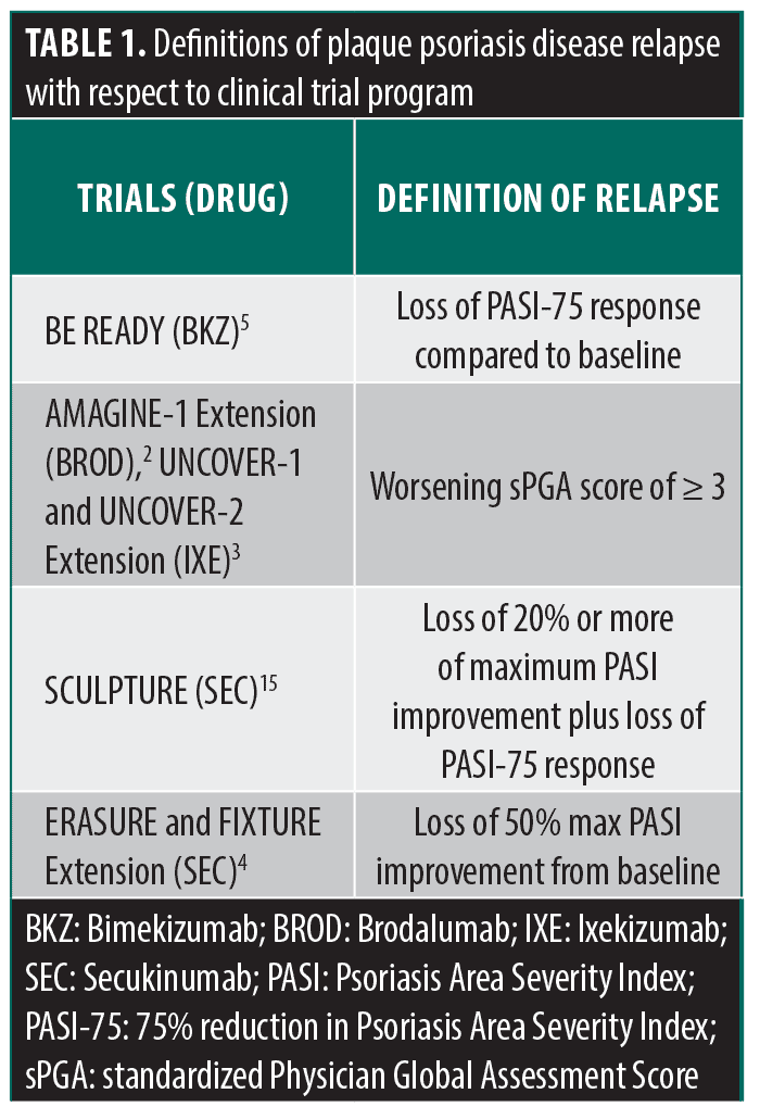 Systemic treatment options for plaque psoriasis (PsO) have significantly evolved and become increasingly more specific in targeting distinct pathways involved in PsO pathogenesis. These therapeutics now include the classes of interleukin (IL)-17 inhibitors and IL-23 inhibitors, among other small molecule inhibitors.1 While there is abundant evidence of their efficacy in placebo-controlled clinical trials, there is a paucity of literature comparing these drugs in randomized head-to-head trials. Additionally, there is even less literature investigating the time to relapse when patients with PsO discontinue treatment after initially achieving treatment success. In the trials that do investigate time to relapse after treatment cessation, they tend to differ in their definition of what constitutes relapse rendering the comparability of drugs across these different trials especially difficult.2–5 Our analysis here addresses the aforementioned differences in biologics specifically within the IL-17 inhibitor class, as this “class” contains therapeutics with heterogeneous mechanisms of action (IL-17A inhibitors, dual IL-17A/F inhibitor, and IL-17 receptor (IL-17RA) inhibitor). This is uniquely different from the IL-23 class in which all p19-specific biologics of this class directly target the IL-23 cytokine and the same isoform of IL-23 albeit via different epitopes.6 The goal of this article is to: (1) establish drug discontinuation as an important aspect in the therapeutic journey of patients with PsO; (2) better guide clinical decision making when considering disease relapse after treatment; and (3) emphasize the need for more stringent relapse criteria to facilitate PsO therapeutic comparisons in the absence of head-to-head randomized controlled trials.