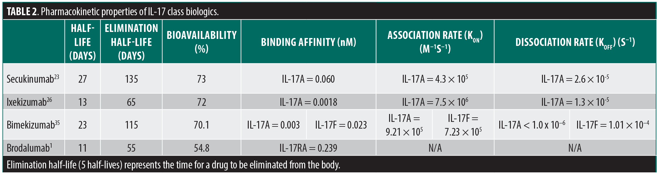The relevant PK properties for each drug include half-life, bioavailability, and equilibrium dissociation constant (Kd, which is inversely proportional to binding affinity), the latter being a composite of the association rate constant (kon) and the dissociation rate constant (koff) (Table 2).6 Of note, kon and koff for BROD binding to IL-17RA are not readily available in public literature. The half-lives for SEC, IXE, BKZ, and BROD are 27 days, 13 days, 23 days, and 11 days, respectively. The bioavailability for SEC, IXE, BKZ, and BROD are 73%, 72%, 70.1%, and 54.8%, respectively.