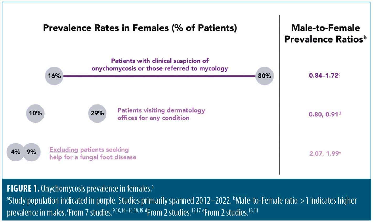 Global prevalence of onychomycosis has been estimated to be approximately 5.5 percent.8 Onychomycosis prevalence in females, however, is difficult to estimate, as reported rates vary greatly. For example, per 11 articles primarily published in the last decade from which female prevalence could be calculated, rates ranged from 4 to 80 percent.9–19 Design differences in these hospital-based studies—including study location, study duration (months to years), patient numbers (hundreds to thousands), and patient populations—could contribute to this variability. As expected, some of the highest female prevalence rates (16–80%) were reported in studies of patients with clinical suspicion of onychomycosis or those referred to mycology, with male-to-female prevalence ratios ranging from 0.84 to 1.72.9,10,14–16,18,19 Intermediate female prevalence rates (10%17 and 29%12) were from patients visiting dermatology offices for any condition, and the male:female prevalence ratio was slightly below 1.0. Finally, the lowest female prevalence rates were in studies that excluded those seeking help for a fungal foot disease (4%11 and 9%13; male:female prevalence ratio of approximately 2) (Figure 1).