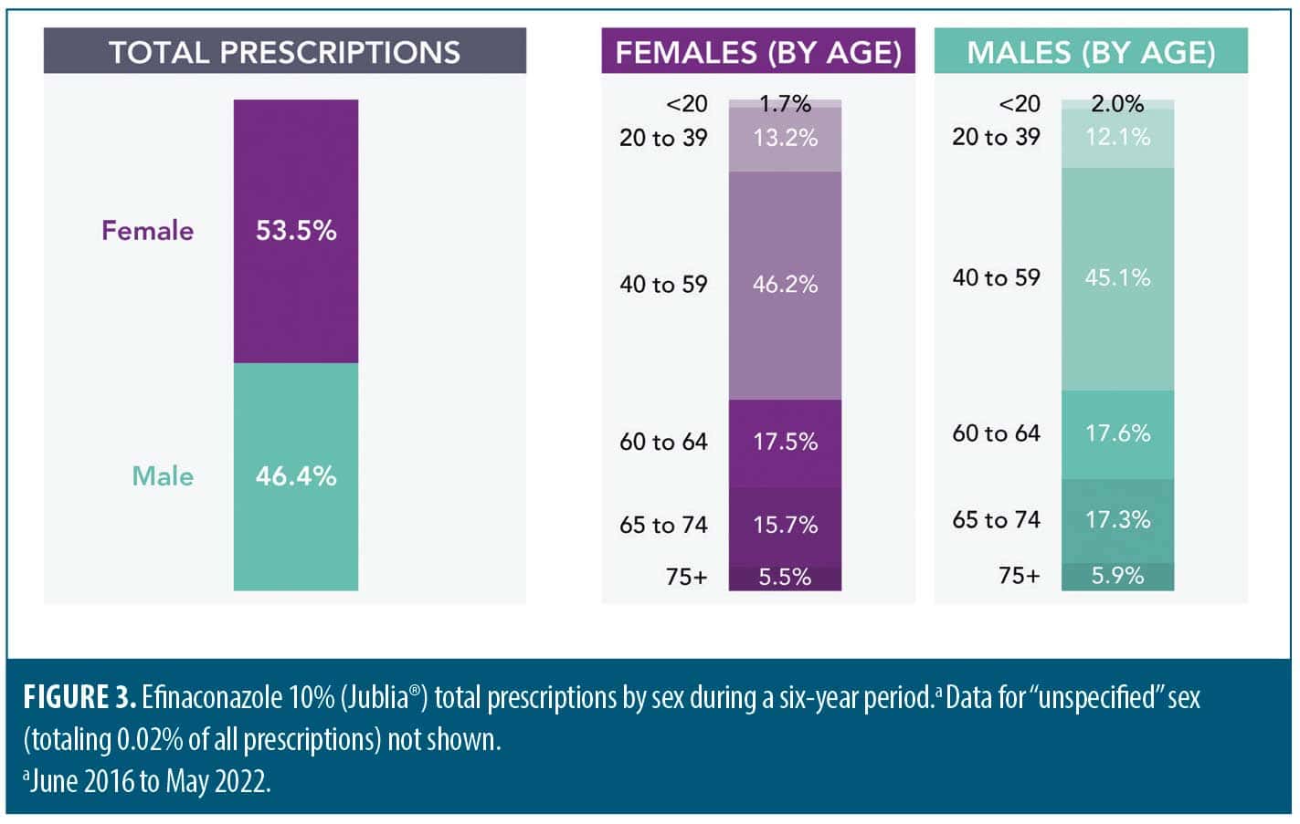 Prescription patterns. Although onychomycosis prevalence generally appears to be greater in men, women represent approximately half or more of patients seeking help or treatment for infected nails. More female patients (57.6% vs. 42.4% male) made visits to physicians’ offices in the US for a possible diagnosis of onychomycosis during an 18-year period from 1993–2010, per the National Ambulatory Medical Care Survey database.59 In the UK between the years 2001 and 2017, a slightly higher proportion of males compared to females (52% vs. 48%) sought treatment for onychomycosis from their general practitioner.60 To explore the treatment of females with onychomycosis in the real world, we analyzed prescription patterns by sex of a commonly used topical antifungal (efinaconazole 10%; Jublia®, Ortho Dermatologics). During the six-year period analyzed, 53.5 percent of prescriptions for topical efinaconazole were to females, indicating that females account for slightly more topical efinaconazole prescriptions than males. (Figure 3).