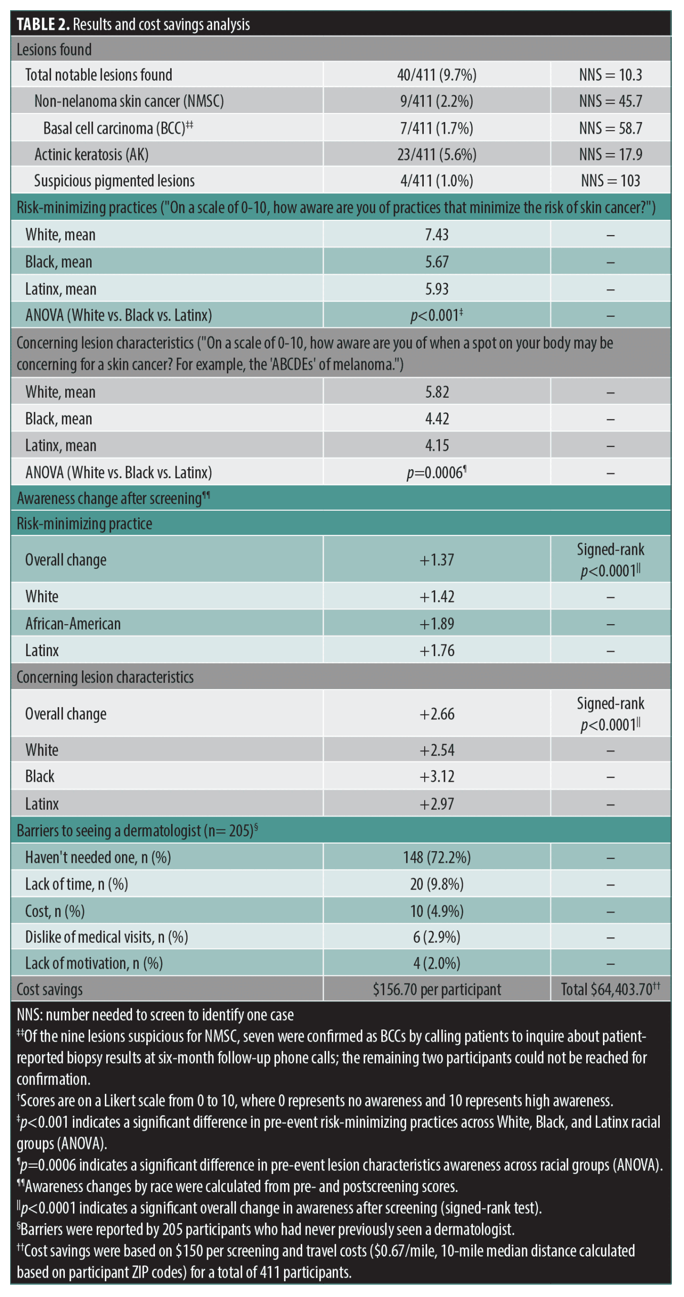 Cost analysis assumed a $150 average skin cancer screening visit cost2 plus $6.70 in travel expenses based on the Internal Revenue Service (IRS) mileage reimbursement rate of $0.67 multiplied by the 10-mile median distance traveled by participants based on ZIP code. The estimated average cost savings per participant was $156.70, resulting in total projected savings of $64,403.70 across all 411 attendees.