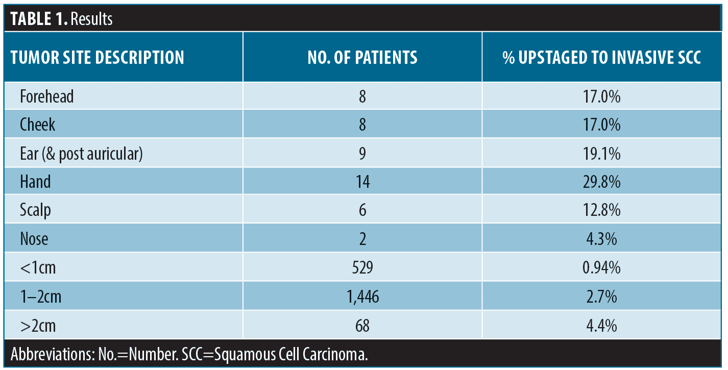 Methods. Patient records of preoperative biopsy-proven SCCIS being treated with Mohs between January 2019 to March 2022 were identified and reviewed. Postoperative diagnoses of invasive SCC proven by dermal infiltration on pathology were identified as upstaged SCCIS.