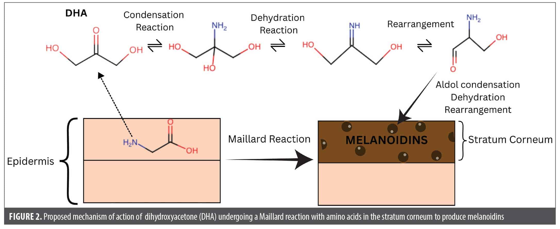Dihydroxyacetone (DHA). Mechanism of action. DHA is a simple three-carbon saccharide commonly used as the active ingredient in sunless tanning products. After being approved in the late 1970s for topical use in cosmetics at concentrations up to 20%, to date, it is the only legal tanning agent approved by the FDA.14 Upon application to the skin, DHA undergoes a Maillard reaction: the carbonyl group of DHA reacts with amino acids such as arginine, histidine, and lysine in the stratum corneum to produce brown-black chromophores, known as melanoidins, which provide a brown coloration (Figure 2).3 DHA is rapidly absorbed in cells and tissues through an unknown transporter and then converted to dihydroxyacetone phosphate by triose kinase/flavin mononucleotide (FMN) cyclase, after which it can then be incorporated into many different metabolic pathways, including glycolysis.15