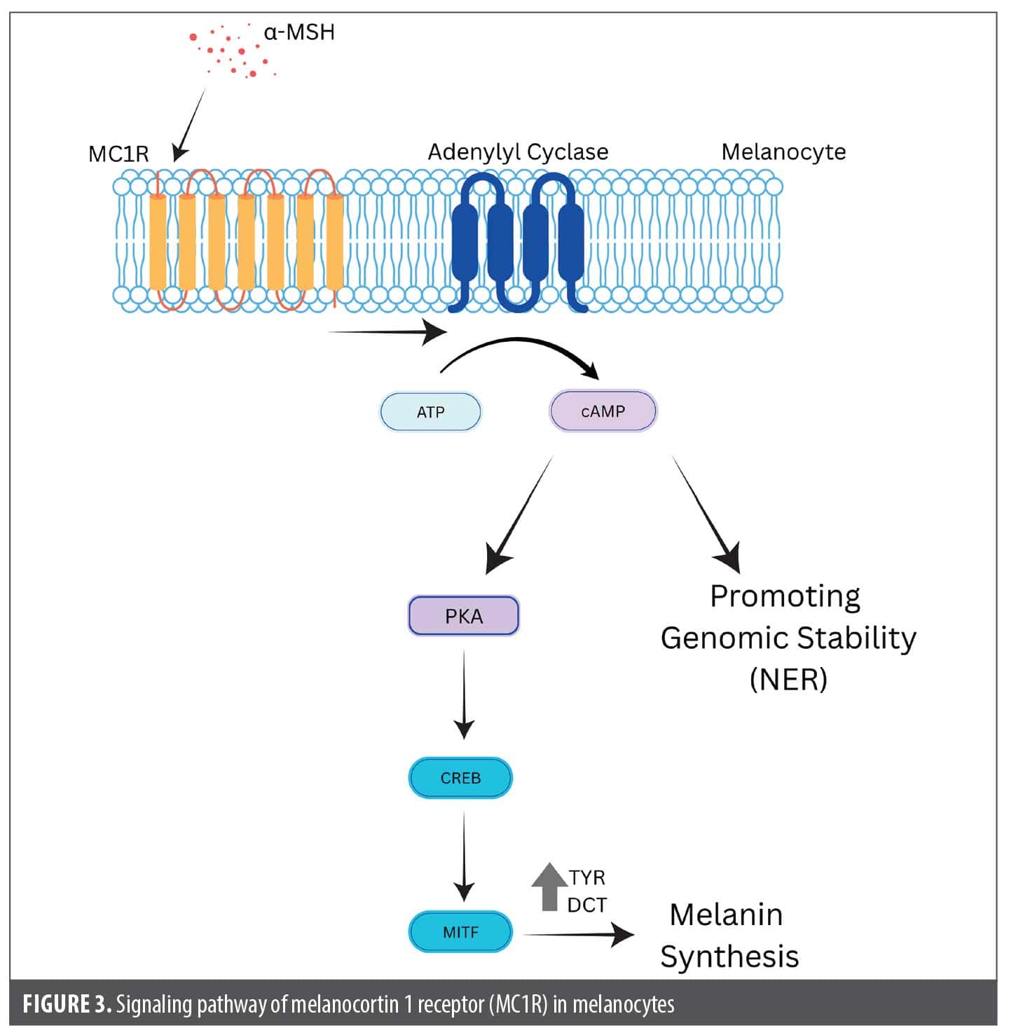 Melanotan. Mechanism of action. Melanotan is a synthetic analog of α-MSH. It acts as a nonselective agonist of one of several MCRs. When acting on the melanocortin 1 receptor (MC1R), melanotan stimulates melanin production and tyrosinase activity, leading to melanocyte proliferation and skin hyperpigmentation (Figure 3).36 Notably, as MC1R is not expressed by melanocyte stem cells, melanotan cannot have an effect on melanocyte differentiation.37 Beyond regulating pigmentation, α-MSH also acts on various other MCRs, playing a role in processes such as appetite regulation and sexual stimulation. Melanotan I (also known as afamelanotide) acts on MC1R and has increased resistance to enzymatic breakdown, whereas melanotan II is a shorter cyclic variant that increases pigmentation at a lower cumulative dose and is less specific and more lipophilic, thereby crossing the blood-brain barrier more easily, leading to more widespread adverse effects.5 Both melanotan I and II are unregulated compounds sold illegally online as a means to stimulate a tan.5