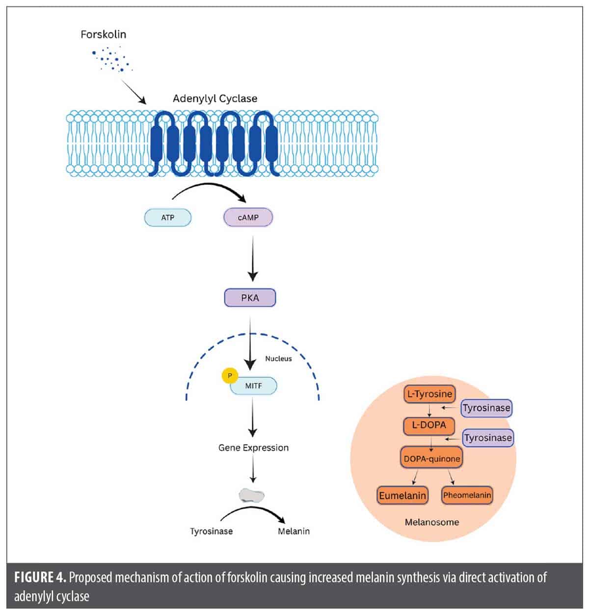 Forskolin. Mechanism of action. Forskolin is a plant-derived compound isolated from the root tissue of Plectranthus barbatus, with demonstrated skin-permeable properties. It directly activates adenylyl cyclase in epidermal cells, leading to increased intracellular cyclic adenosine monophosphate (cAMP) levels, which in turn stimulate melanogenesis in melanocytes independent of MC1R function. The increase in cAMP activates downstream signaling cascades, primarily through protein kinase A (PKA), and upregulates the expression of melanogenic enzymes, resulting in increased eumelanin synthesis and visible skin darkening (Figure 4). This mechanism has been demonstrated in animal models, including MC1R-defective mice, where topical forskolin application led to persistent epidermal melanization.48