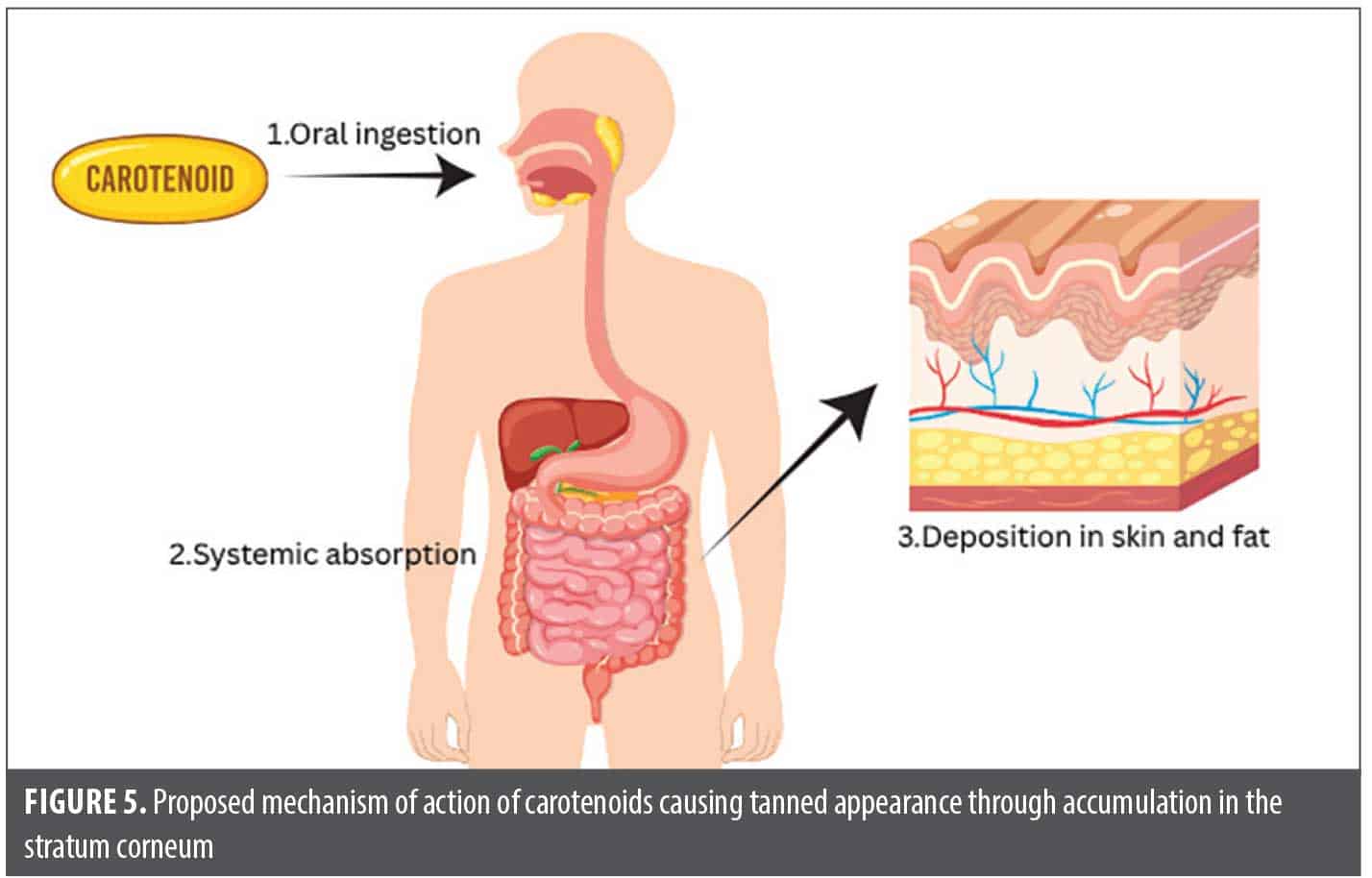 Carotenoids. Mechanism of action. Orally administered carotenoids are absorbed in the small intestine, packaged into chylomicrons, and transported via lipoproteins to peripheral tissues, most notably the skin.55 Within the epidermis, they function as potent antioxidants by neutralizing ROS generated by UV exposure.56 This antioxidant activity reduces UV-induced oxidative stress, thereby decreasing lipid peroxidation, DNA damage, and inflammatory response. Simultaneously, carotenoids accumulate in the stratum corneum, producing a gradual yellow-orange hue that becomes visible over time, particularly in low-melanin and sun protected areas such as the palms or inner arms (Figure 5).57 This coloration process occurs independently of melanocyte stimulation.58