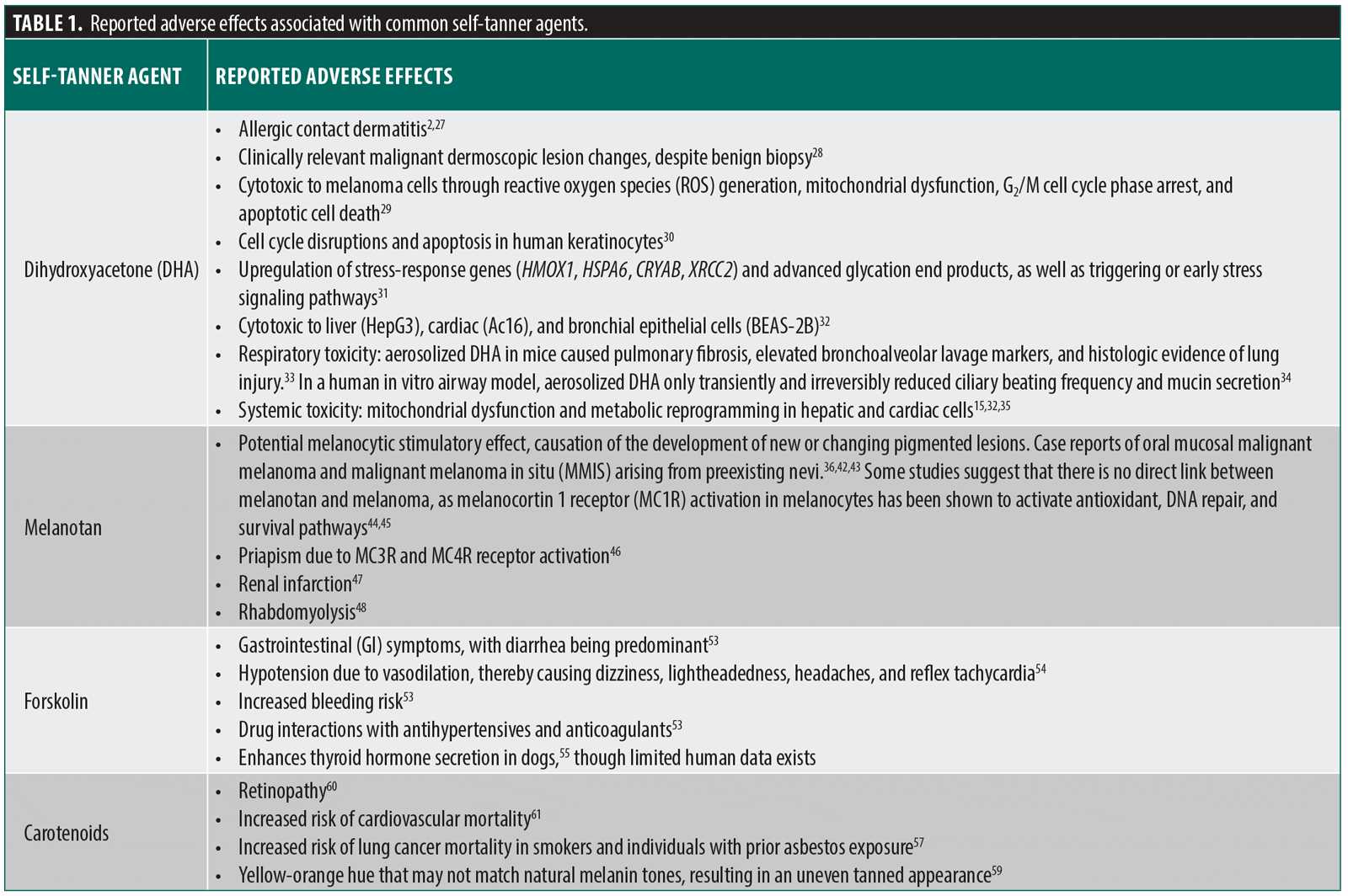 ≥25 mM DHA, while short-term exposure (3 hours) to ≤50 mM caused no immediate toxicity.30 These effects were attenuated by antioxidant pretreatment, implicating ROS as a mechanistic driver.30 Concentrations used in the study (25-100 mM) were even lower than those found in commercial tanning lotions (≥330 mM). Perer et al31 confirmed the upregulation of stress-responsive genes (HMOX1, HSPA6, CRYAB, XRCC2) and advanced glycation end products (AGEs) following DHA exposure. DHA at concentrations ≤20 mM did not impair viability, whereas higher doses (≥40 mM) led to significant cell death.31 Acute DHA exposure (defined as ≤50 mM; 1hr in phosphate-buffered saline followed by 24 hrs in growth medium) also triggered early stress signaling pathways, including p38 MAPK activation, Hsp27 phosphorylation, and eIF2α phosphorylation.31 Beyond skin models, DHA has been shown to be cytotoxic to liver (HepG3), cardiac (Ac16), and bronchial epithelial (BEAS-2B) cells at concentrations as low as 1.5 mM to 7.5 mM.32 Contrary to early skin model studies, Hernandez et al32 found only low or inconsistent levels of ROS and AGEs in systemic models, suggesting that DNA damage is not primarily ROS-mediated and instead may occur through mechanisms such as glycation or crosslinking of DNA repair proteins.