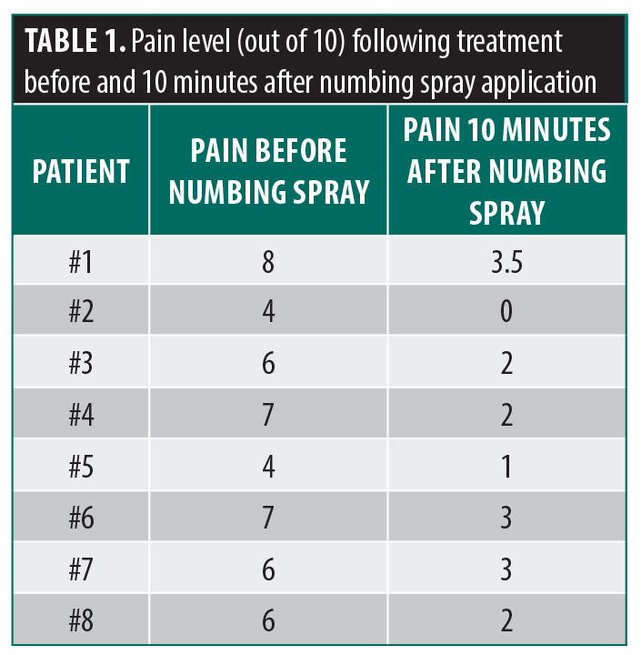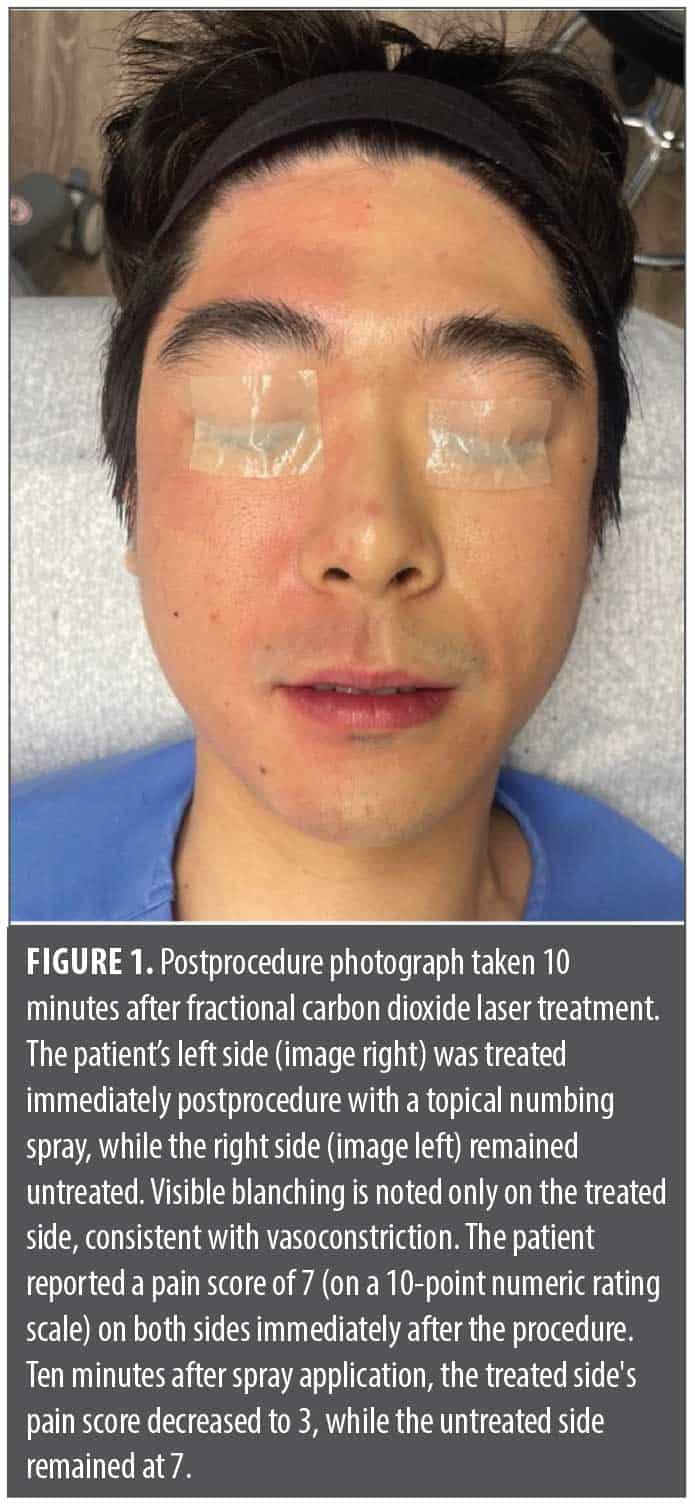 A preliminary observational series was conducted with patients (n=8), aged 28 to 57 years, who underwent fractional CO2 laser resurfacing. On average, pain scores were reduced by 68% within 10 minutes of numbing spray application (p<0.001, paired t test). Decreased clinical erythema and edema were observed compared to the expected post-CO2 laser appearance, as demonstrated in the patient, who provided photoconsent, in Figure 1. Additionally, patients who received the intraprocedural anesthetic spray reported greater comfort during subsequent deeper laser passes. Table 1 highlights pain responses before and after the numbing spray.