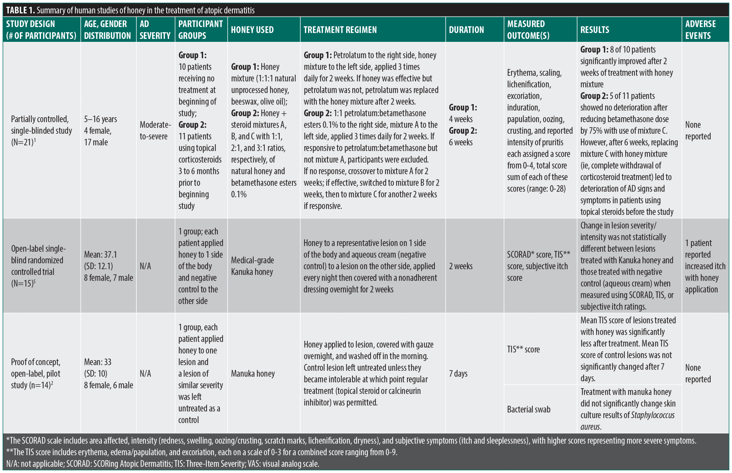 On January 19, 2025, an online search was conducted using the databases PubMed, Embase, and Web of Science to identify all published clinical trials investigating the use of honey in the treatment of AD in human participants. This search yielded 5 studies that met our inclusion/exclusion criteria. A detailed summary of all study characteristics and outcomes can be found in Table 1. Four studies reported that treatment with topical honey resulted in statistically significant improvements in AD symptoms using measures of severity including Three-Item Severity scores, SCORing Atopic Dermatitis, and Visual Analog Scale (VAS).1–4 One study also measured outcomes in eczematous external otitis using VAS and found that VAS scores for discomfort and itching significantly decreased after 2 weeks of treatment with honey eardrops.3 Only 1 of the 5 studies reported that treatment with honey was not significantly more efficacious than control (aqueous cream).5 Two studies collected bacterial swabs of lesions before and after honey treatment.2,3 While both studies found that treatment with manuka honey did not significantly change skin culture results of Staphylococcus aureus, 1 study did find that in some participants, honey eardrops led to a shift from commensal bacterial colonization pretreatment to negative culture posttreatment.2,3 Interestingly, 1 study found that adding topical honey as part of the treatment regimen enabled patients previously using topical corticosteroids to reduce their dose by 75% without clinical deterioration or exacerbation of symptoms.1 This suggests that topical honey may be especially useful as an adjunct therapy to optimize symptom control while using lower doses of conventional treatments like topical corticosteroids, minimizing the risk of adverse effects. Topical honey was generally well tolerated across all studies with minimal adverse events (increased itching in 1 patient in 1 study).5