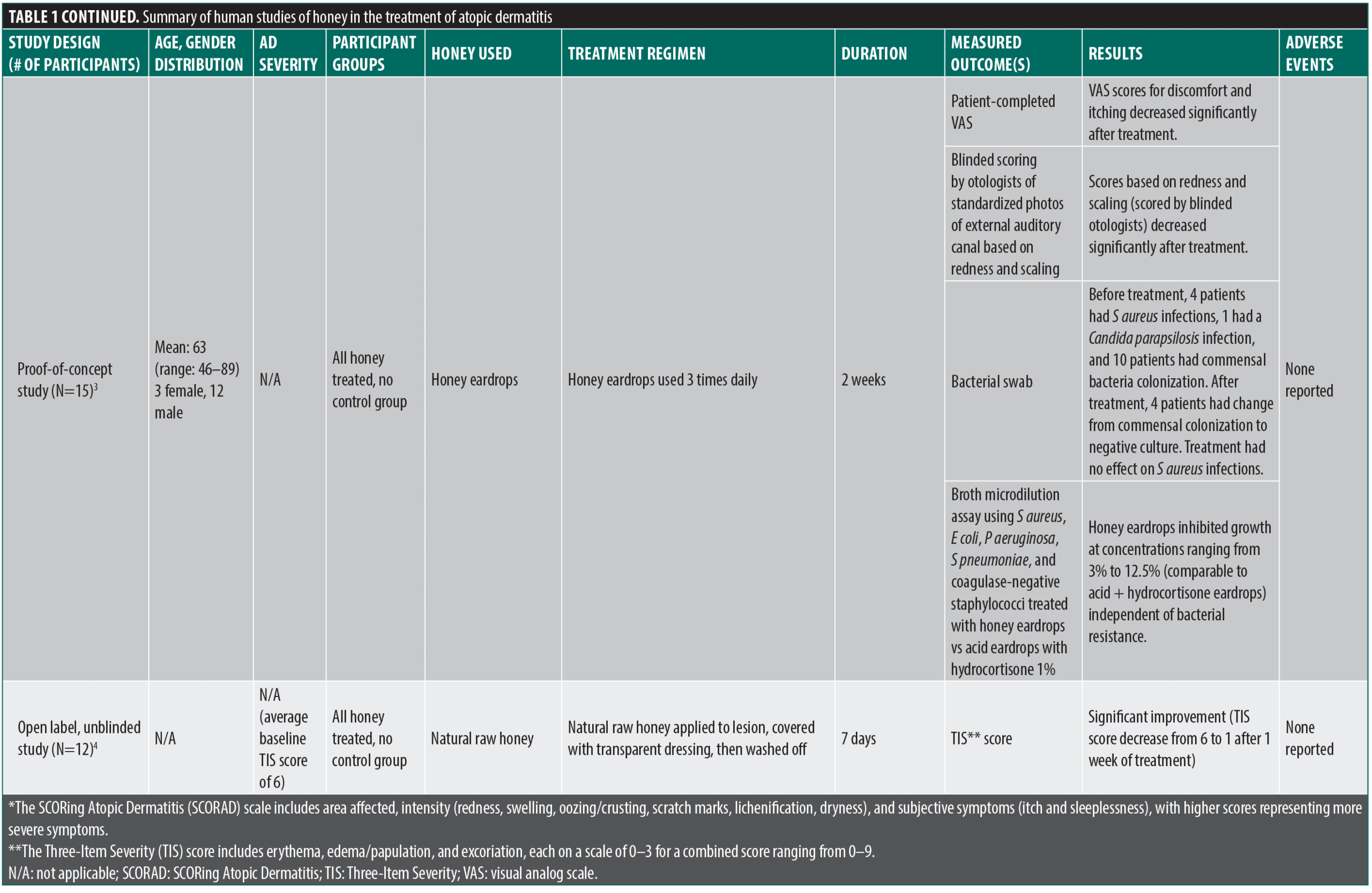 - Alangari AA, Morris K, Lwaleed BA, et al. Honey is potentially effective in the treatment of atopic dermatitis: clinical and mechanistic studies. Immun Inflamm Dis. 2017;5(2):190–199.