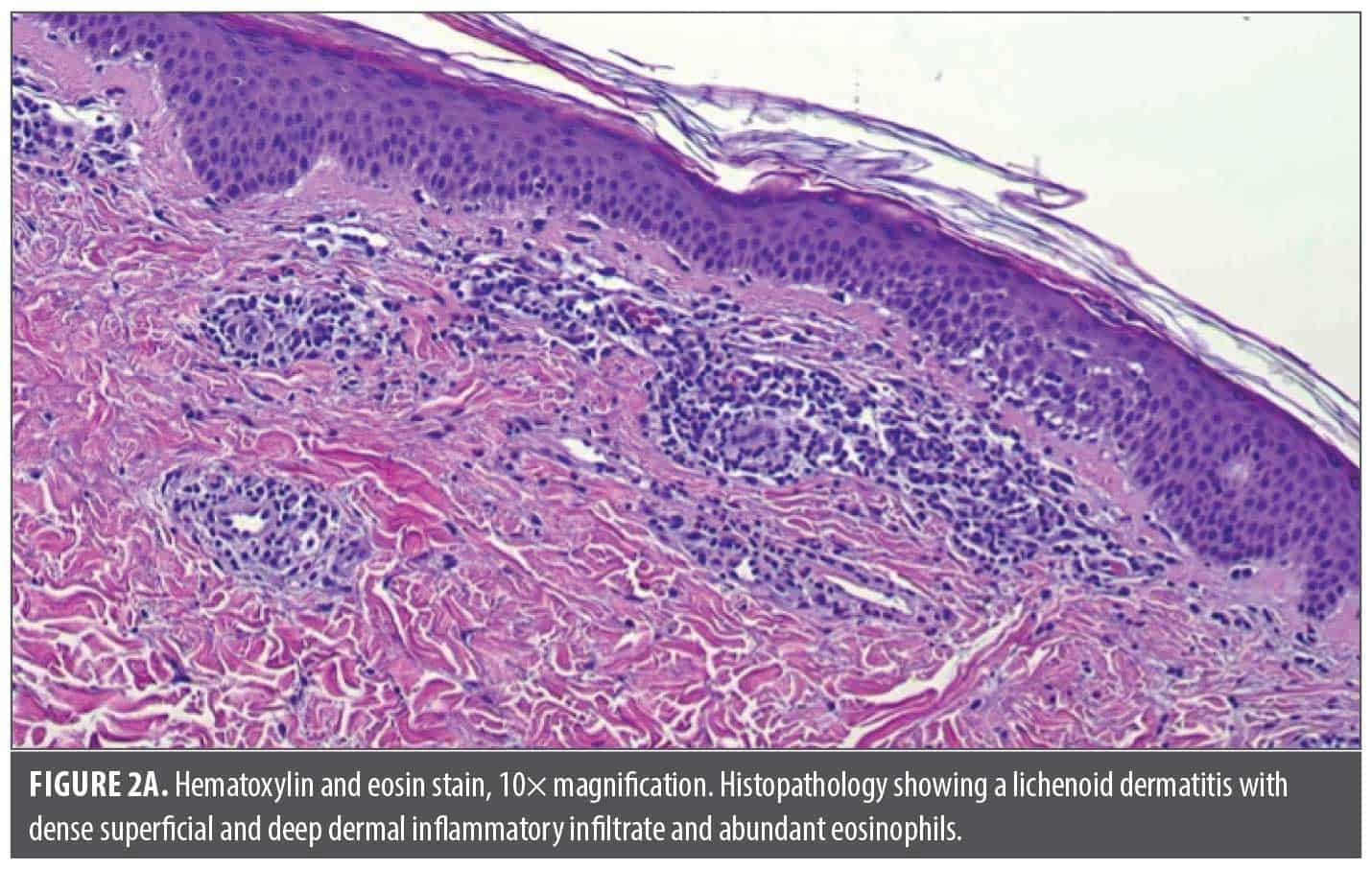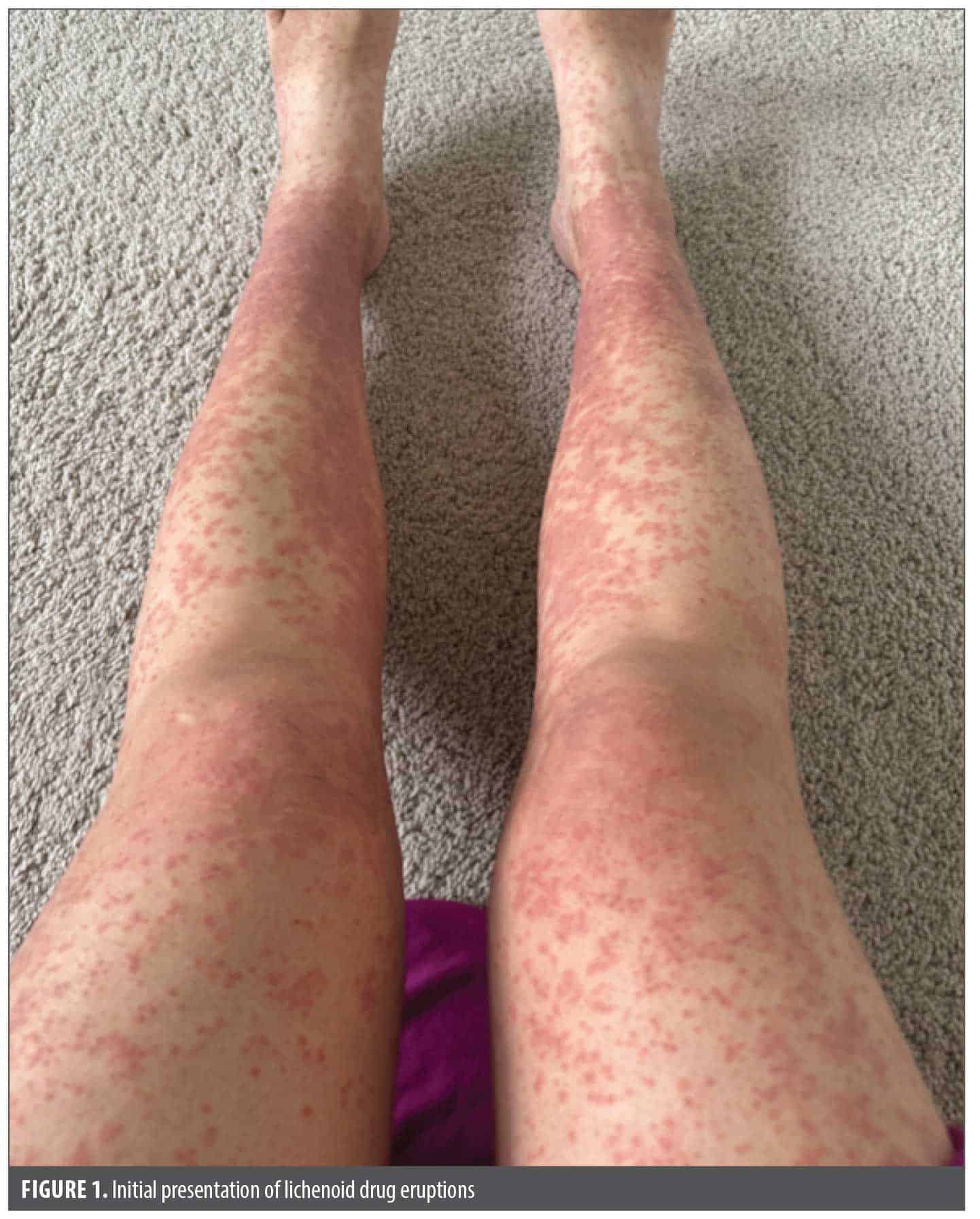 Cutaneous lichenoid drug eruptions (LDE) are a group of relatively uncommon adverse drug reactions (ADR) characterized by widespread erythematous to violaceous scaly papules that can be difficult to differentiate from idiopathic lichen planus.1,2 The long latency period after drug exposure (mean: 15.7 weeks) and failure to resolve even after drug cessation add to the diagnostic challenge.1 Moreover, the rise of new therapies such as biologics, tyrosine kinase inhibitors, and immune checkpoint inhibitors (ICIs) has appeared to increase the prevalence of drug-induced lichenoid reactions.3 Other classes of medications that have been implicated include antibiotics, antihypertensives, diuretics, antimalarials, and nonsteroidal anti-inflammatory drugs (NSAIDs).4