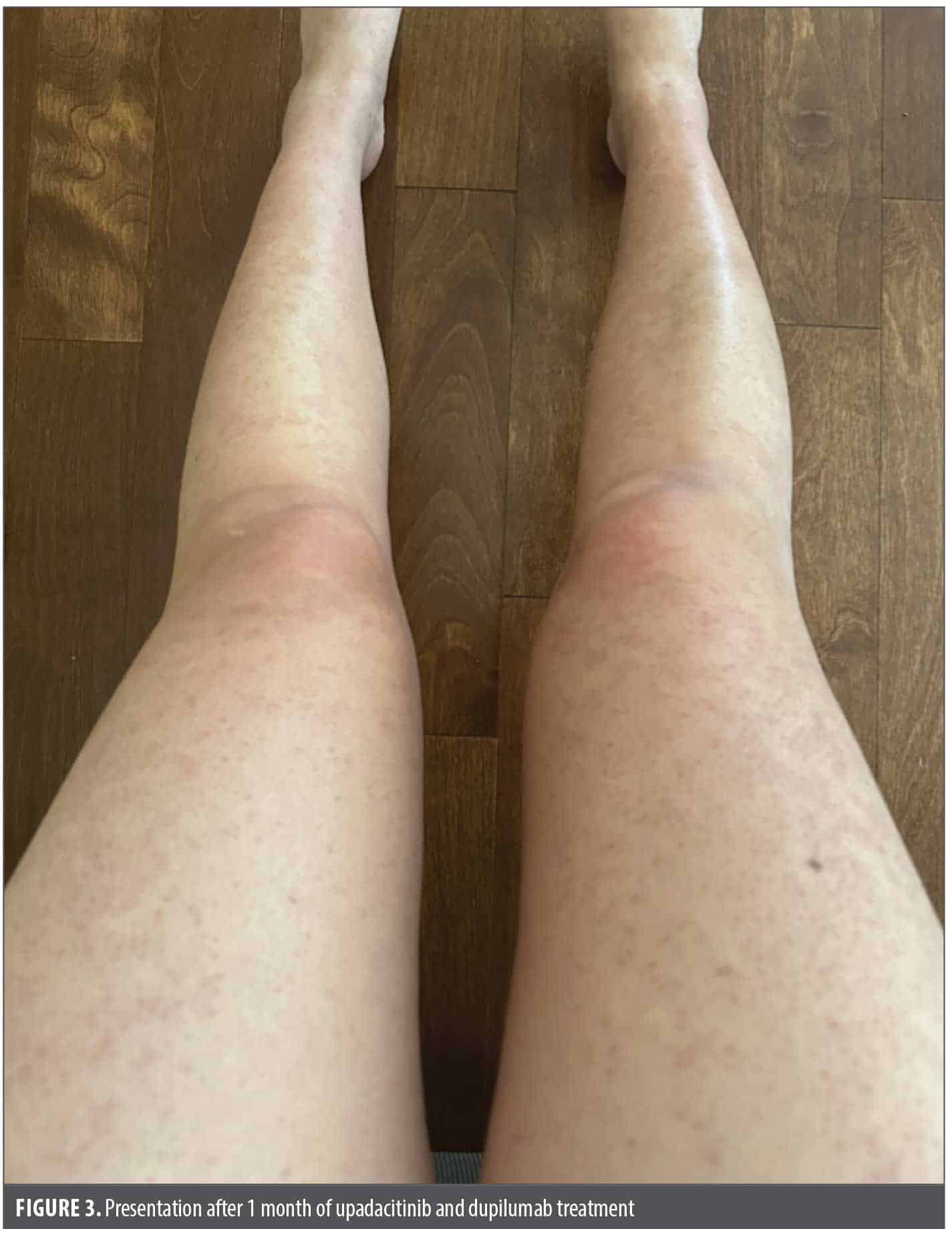 Punch biopsy of the most representative areas showed a lichenoid dermatitis with an abundance of eosinophils, highly suggestive of a drug-induced lichenoid eruption (Figure 2). Cetirizine was discontinued, and the patient was started on prednisone 60 mg daily along with clobetasol cream, 0.05%, twice daily. After 11 days of prednisone treatment, the patient reported marginal improvements in her rash and itch and had difficulty sleeping because of the corticosteroids. At this point, the patient was started on samples of upadacitinib 15 mg daily (after baseline laboratory evaluation) and quickly tapered off prednisone. After 14 days of upadacitinib treatment, she reported her itch had improved from a 6 out of 10 (while on prednisone) to a 1 out of 10, but she still had extensive skin involvement. This prompted a dose escalation of upadacitinib to 30 mg daily. At her 3-week follow-up, her itch remained under good control, but she still had active skin disease. Dupilumab (600-mg loading dose, then 300 mg every 2 weeks) was added, and at her 4-week follow-up, her skin was nearly completely clear except for mild postinflammatory erythema (Figure 3). The patient was subsequently tapered off upadacitinib and dupilumab over 2 additional months and her skin has remained clear.