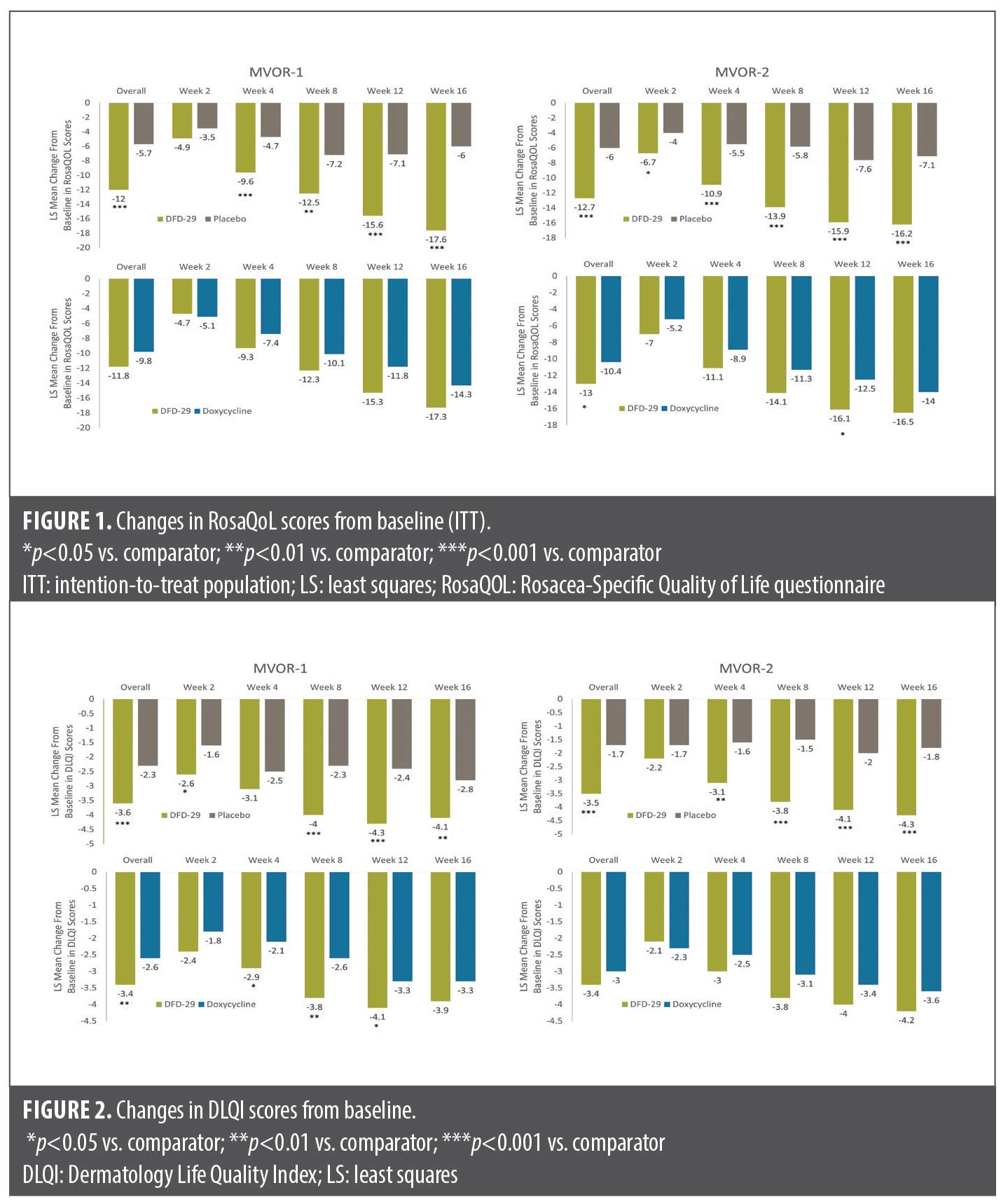 Both DFD-29 and doxycycline improved RosaQoL scores in both trials (Figure 1C and 1D). At Week 16, there were no significant differences in LS mean improvements in RosaQOL scores between DFD-29 and doxycycline in either MVOR-1 (–17.3 [1.4] vs. –14.3 [1.5]; p=0.148) or MVOR-2 (–16.5 [1.3] vs. –14.0 [1.3]; p=0.145), but improvements with DFD-29 were numerically greater in both studies. In MVOR-2, DFD-29 was associated with a significantly superior improvement in LS mean (SE) RosaQoL scores at Week 12 (–16.1 [1.3] vs. –12.5 [1.2]; p=0.034). The MMRM analysis of overall LS mean changes (SE) in RosaQoL also revealed a significantly superior improvement with DFD-29 vs doxycycline in MVOR-2 (–13.0 [1.0] vs. –10.4 [1.0]; p=0.049) but not in MVOR-1 (–11.8 [1.1] vs. –9.8 [1.1], p=0.17).