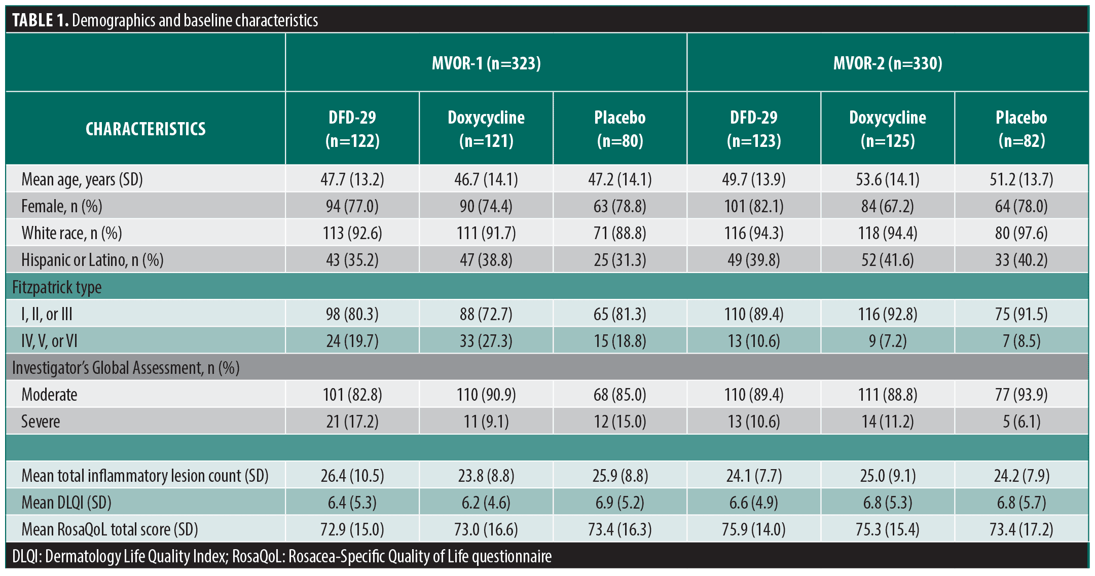 Patient disposition. Of the 653 patients enrolled in both trials, 323 were randomized and 288 completed MVOR-1 (117 on DFD-29; 98 on doxycycline; 73 on placebo) while 330 were randomized and 296 completed MVOR-2 (115 on DFD-29; 113 on doxycycline; 68 on placebo). The disposition of patients in both trials have been described in detail in a previous report.33
