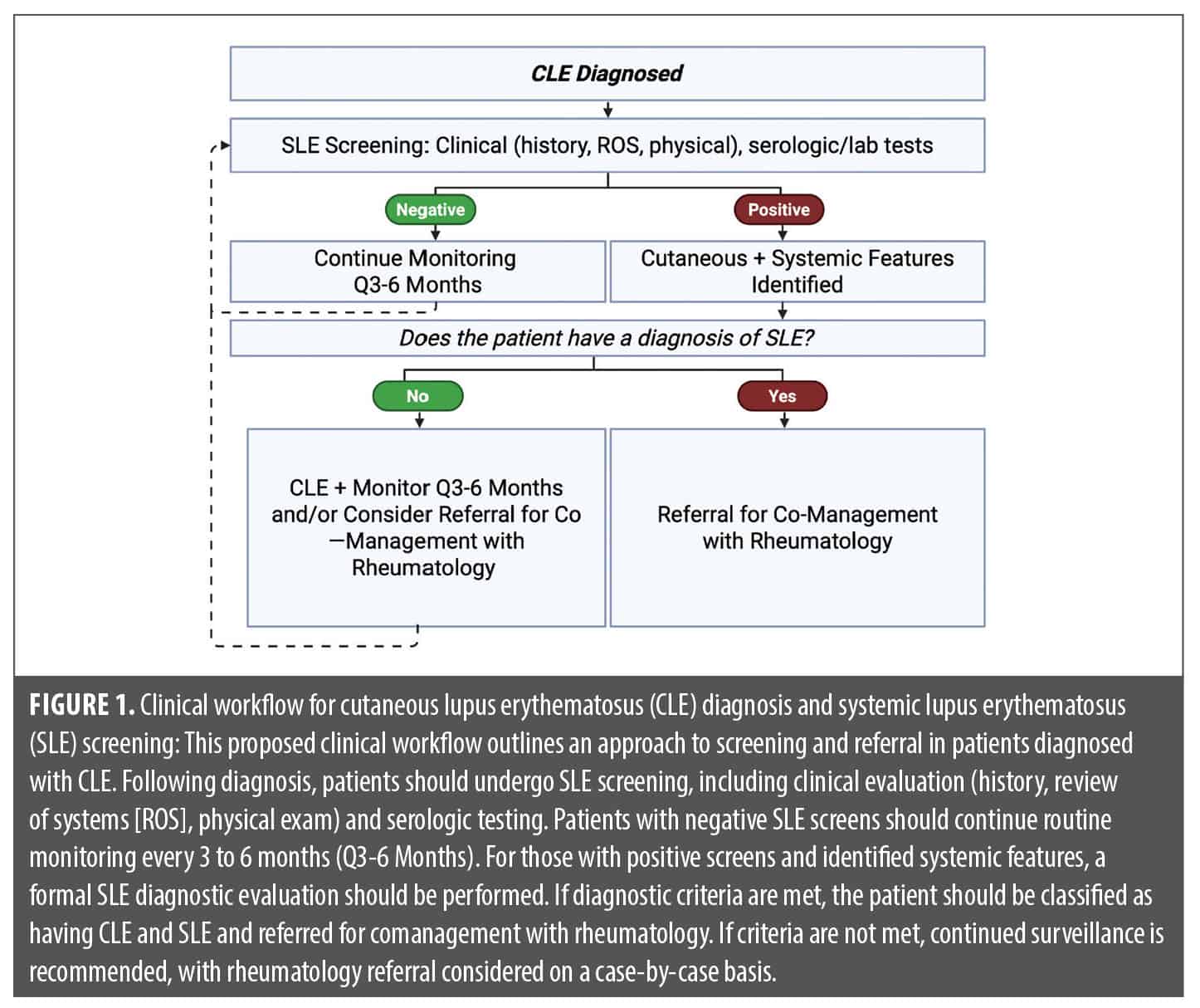 Short courses of systemic corticosteroids may be used for severe flares, although less commonly and typically with less success than when utilized for SLE end-organ disease flares. If antimalarials fail and/or in severe disease, second-line agents such as methotrexate (MTX), mycophenolate mofetil (MMF), dapsone, and acitretin have historically been considered next. In refractory cases, third-line options typically include thalidomide, lenalidomide, belimumab, and intravenous immunoglobulin (IVIG), with mixed case series supporting use of anifrolumab, rituximab, deucravacitinib, litifilimab, plasmapheresis or photopheresis, and baricitinib.4,7-12 The shifting therapeutic landscape of emerging agents is already impacting current real-world use, as further discussed in subsequent sections. The comanagement of patients with a rheumatology specialist is advised among patients who screen positive for SLE or who have evolving features of SLE (Figure 1).