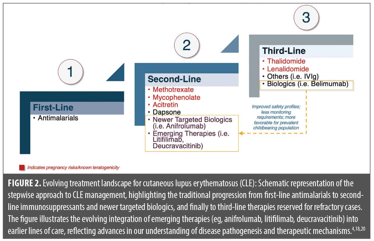 This shift is particularly relevant for women of childbearing potential, in whom traditional agents—such as methotrexate, mycophenolate, acitretin, thalidomide, and lenalidomide—may be contraindicated due to known teratogenicity. This is especially important given that SLE is at least six times more prevalent in women than in men, with the highest incidence occurring among women of childbearing age.16 In these scenarios, biologics with more favorable reproductive safety profiles, such as belimumab and anifrolumab, are often preferred, particularly as new safety data unfolds.17,18 Agents such as IVIG, thalidomide, and lenalidomide are typically reserved for highly refractory cases.