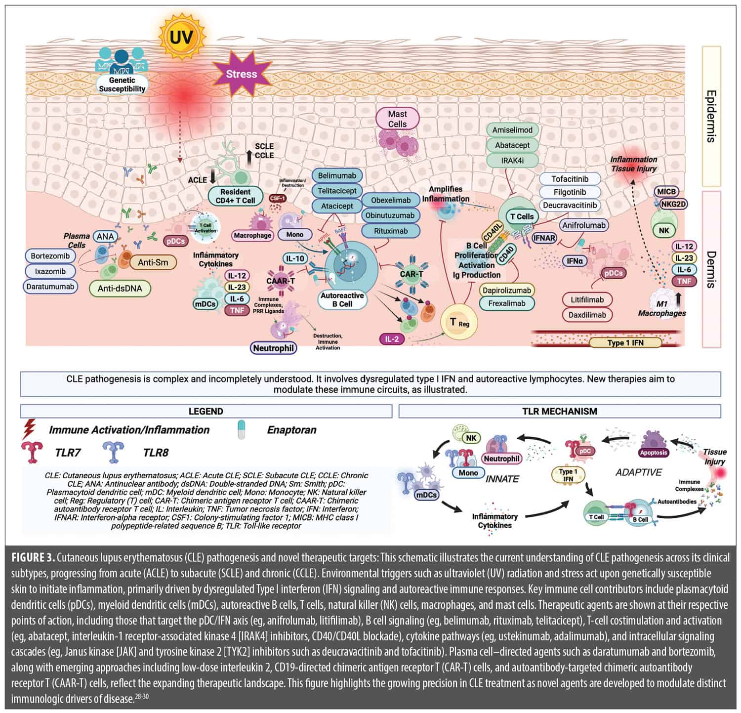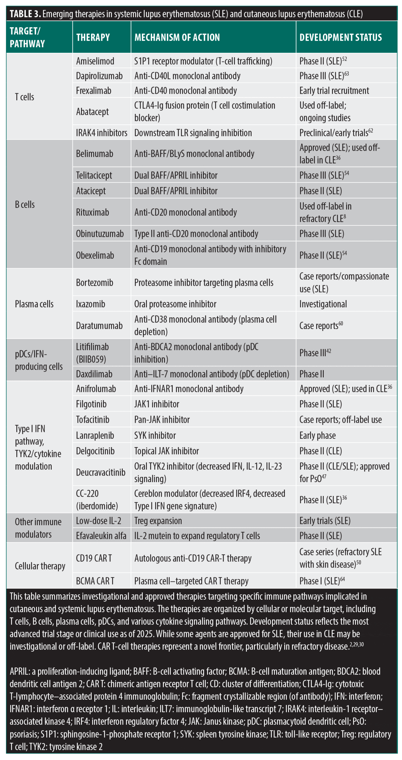 Novel and pipeline therapies. The therapeutic landscape of CLE is transforming, driven by advances in our mechanistic understanding of disease pathogenesis. Nonspecific effects and long-term toxicity of conventional immunosuppressants underscore the need for more selective, targeted interventions. Recent and ongoing clinical trials have yielded promising agents that modulate critical immune pathways implicated in SLE and CLE, such as Type I IFN signaling, B-cell activation, and T-cell costimulation. This section highlights key therapies at the forefront of this paradigm shift, including recently approved agents such as belimumab and anifrolumab, and late-stage investigational drugs such as litifilimab and deucravacitinib. Emerging immunotherapeutic approaches such as chimeric antigen receptor T-cell (CAR T) and chimeric autoantibody receptor T-cell (CAAR T) therapy, though currently under investigation primarily in SLE and lupus nephritis, may have future implications for select CLE subsets as mechanistic understanding evolves (Figure 3).28-30 These therapies reflect a growing movement toward personalized, pathway-specific treatment strategies in CLE.