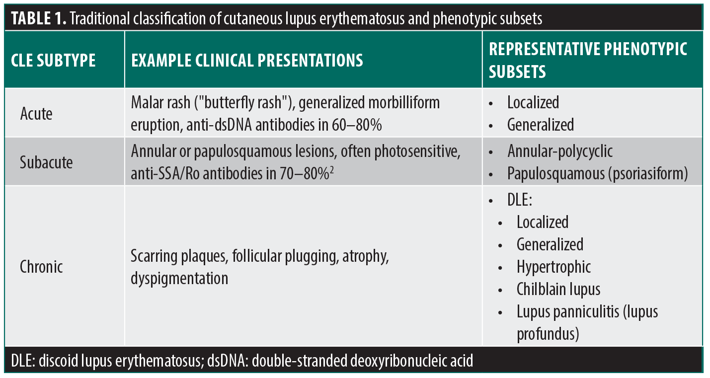 Cutaneous lupus erythematosus (CLE) is a chronic autoimmune skin disease that encompasses a heterogeneous array of clinical subtypes classified as acute, subacute, or chronic. Acute CLE (ACLE) includes manifestations such as malar erythema; subacute CLE (SCLE) is characterized by annular or papulosquamous lesions; and chronic CLE (CCLE) comprises localized, generalized, and hypertrophic forms of discoid lupus erythematosus (DLE) (Table 1).1,2