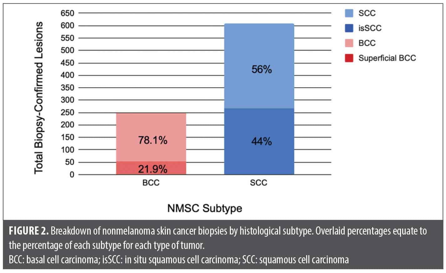 Another factor that could contribute to the discrepancy between epidemiologic teachings and our findings is biopsy practices. Under the current NMSC epidemiology teachings, dermatologists are trained to anticipate more BCC-suspicious lesions and fewer SCC-suspicious lesions, resulting in fewer biopsies of SCC in favor of BCC, especially for superficial or in situ lesions that may not clinically differ from hypertrophic AKs. When dermatologists encounter hyperkeratotic suspicious lesions, many are presumed to be hypertrophic AKs and treated with liquid nitrogen freezing rather than biopsy. This bias in biopsy practices could also contribute to prior misconceptions about the relative frequencies of BCC and SCC.