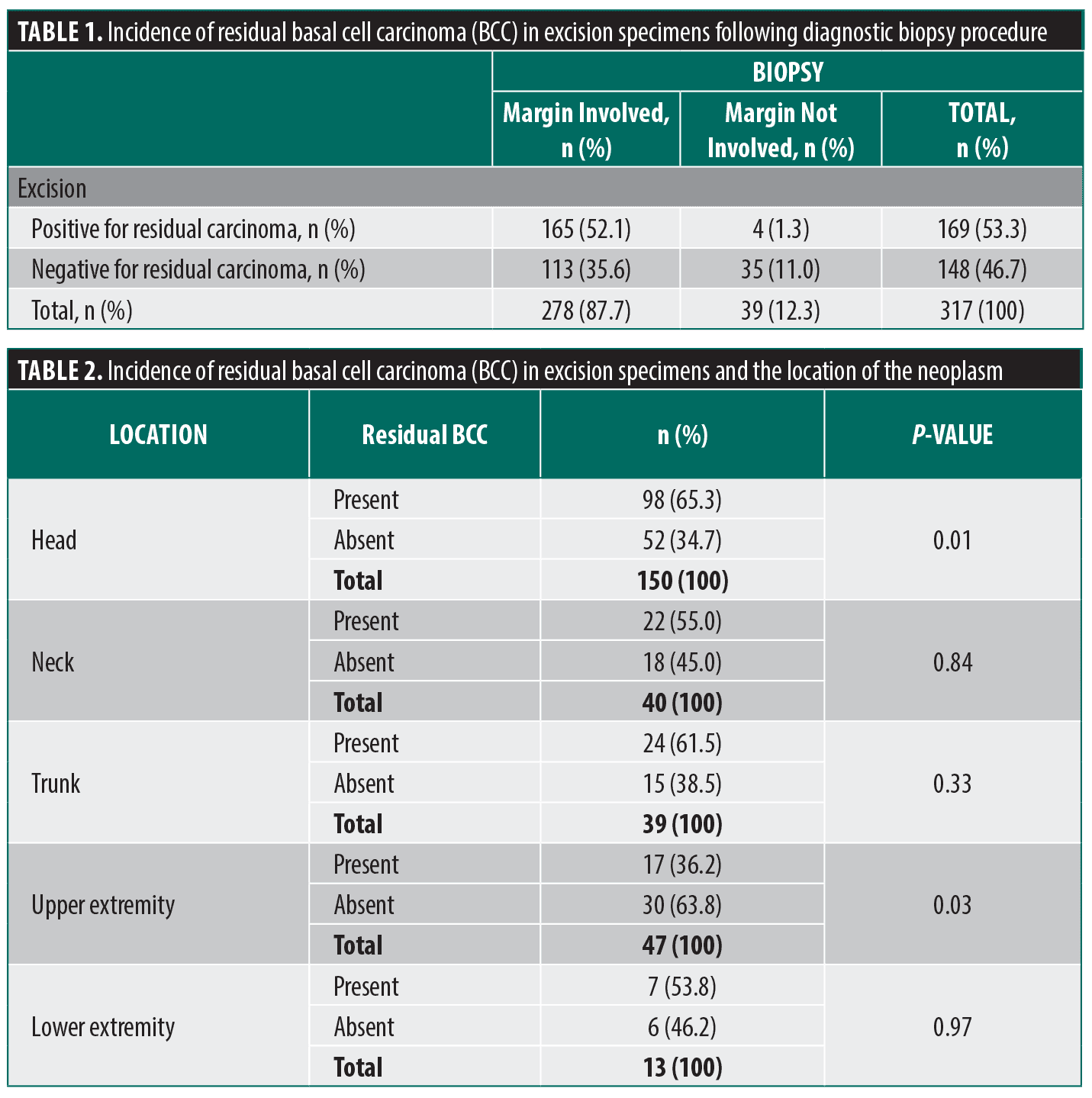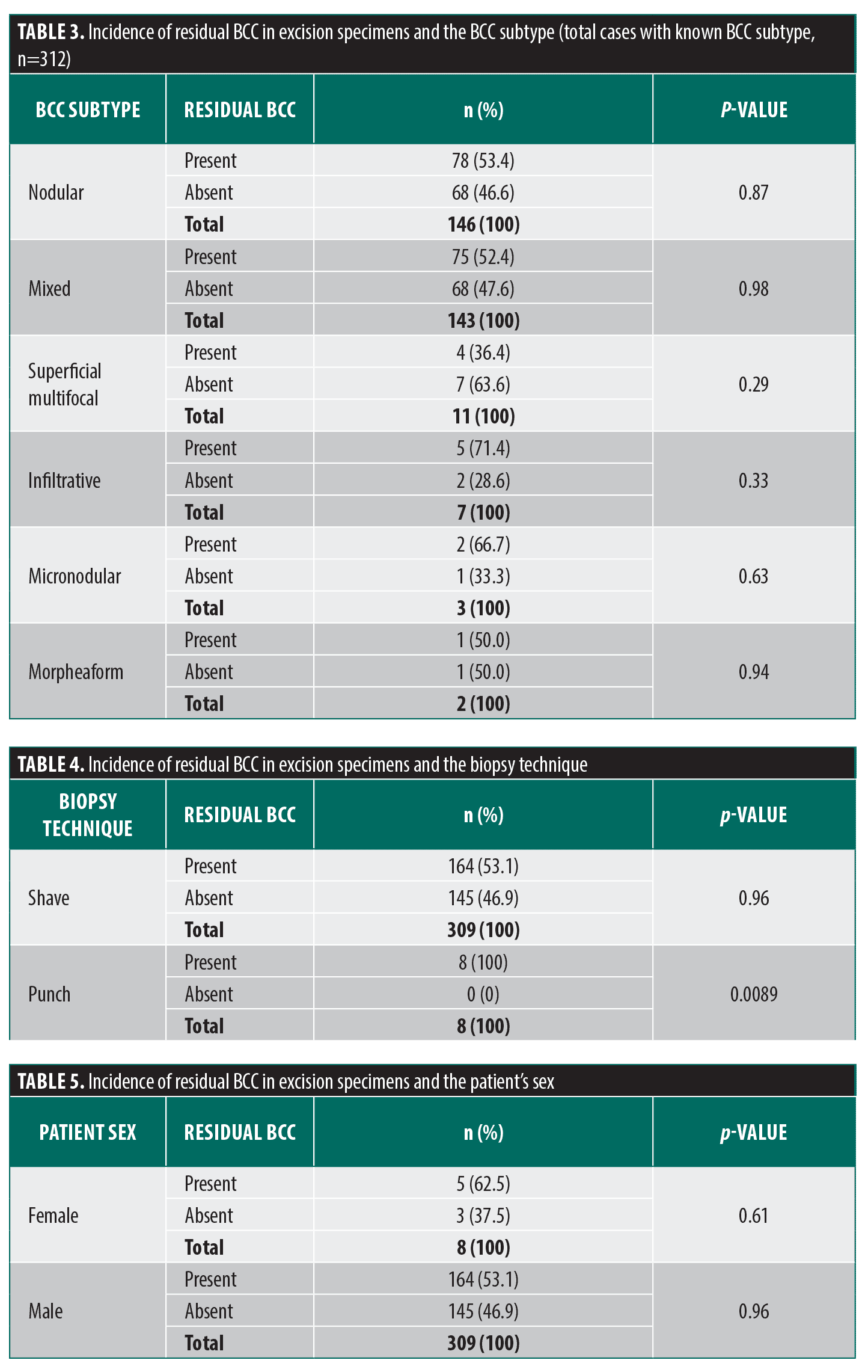 Basal cell carcinoma (BCC) is the most frequent cancer in adults with lighter skin tone.1 BCCs are slow growing, locally aggressive, malignant, epidermal skin tumors.2 The two major implications of BCCs for healthcare systems are their potential for multiple tumors occurrence in the same patient3 and their unpredictable clinical course,4 which precludes conservative management and makes surgical excision a first-line approach in management.5 A peripheral margin of 4 to 5mm is usually recommended for excision, a cutoff dictated by a tendency of asymmetrical subclinical extension beyond the clinically visible tumor.6 Surgical excision appears to be an effective treatment for BCC, with the five-year cure rate reported of 95.2% in one study.7 However, no suspected lesion should be treated without histopathologic confirmation,8 despite a 60 to 70% accuracy rate for clinical diagnosis.9 Two most widely employed techniques are the shave biopsy and the punch biopsy, both of which have shown comparable diagnostic accuracy.8 Multiple studies have examined the incidence of residual BCC following a diagnostic biopsy procedure with recurrence rates ranging from 19 to 85%.10–19 The two most recent studies, performed in 2023 and 2024, reported 53.8% and 39.4% residual tumor occurrence rate, respectively.14,17 Factors associated with residual tumor on excision have also been studied extensively.20–25 Among those, large tumor diameter, increased patient age, failure to achieve initial negative margin resection,23 and infiltrative and micronodular histopathological subtypes24 are considered the most significant.