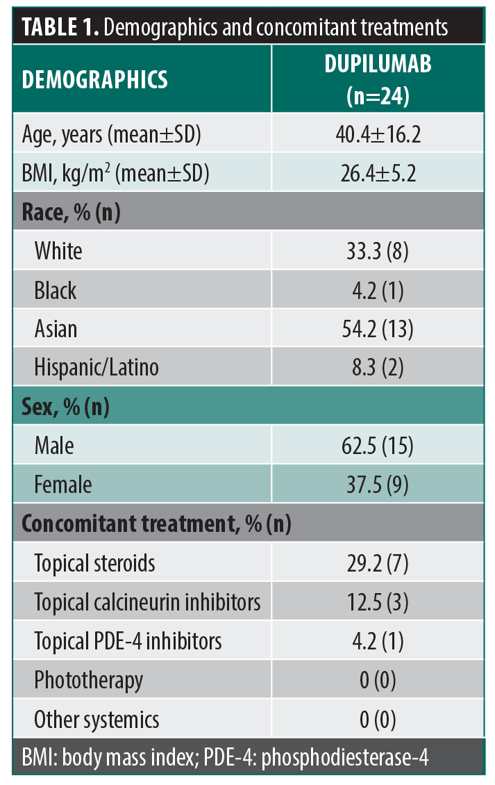 Treatment. All patients enrolled in the study self-administered dupilumab subcutaneously per the United States Food and Drug Administration-recommended dosing for adults with AD at an initial loading dose of 600 mg followed by 300 mg every other week through the duration of the study.