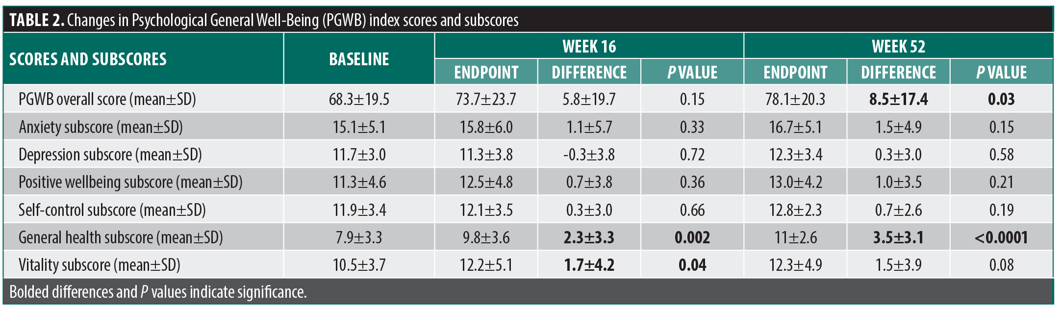 In our study, the mean PGWB before treatment with dupilumab was 68.3—considered indicative of moderate distress—and comparable to those of patients with nondermatologic serious conditions. For example, other studies of cohorts with type 2 diabetes, congestive heart failure, breast cancer, and inflammatory bowel disease reported mean PGWB scores ranging between 66.9 to 74.6, indicating comparable psychological burden.18,25–27 In our study, after 52 weeks of treatment with dupilumab, the mean PGWB score significantly improved to a level indicative of no distress. When comparing AD participants treated with dupilumab vs patients with psoriasis treated with adalimumab, the latter achieved statistically significant improvements in total PGWB by Week 4. These results indicate that AD patients may need longer periods to endorse improvement in psychological wellbeing.