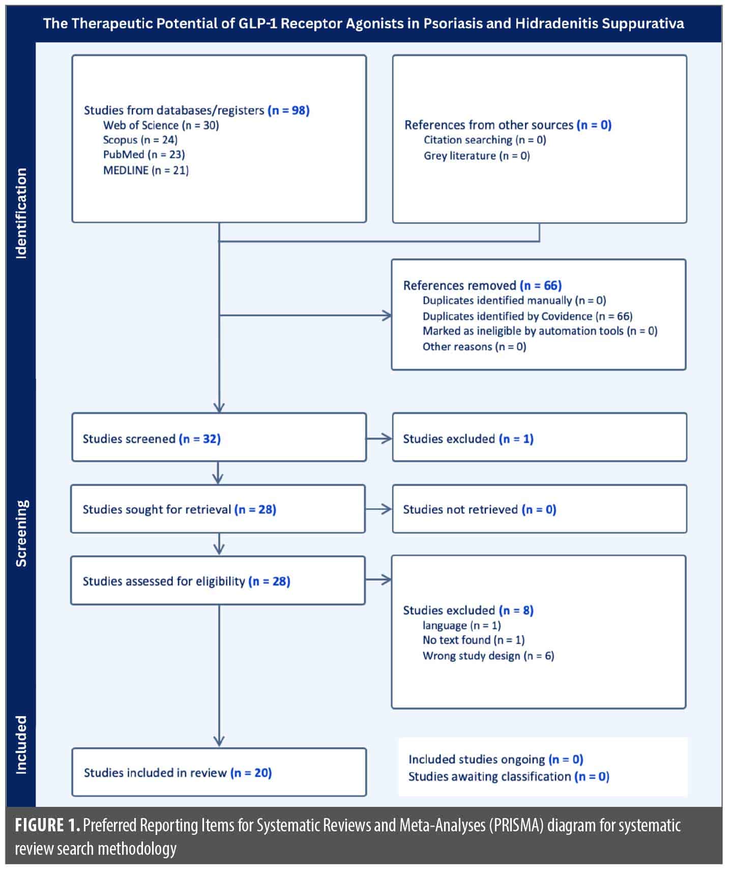 A total of 98 articles were identified across all four databases. After removal of 66 duplicates, 32 unique articles were screened. Following a full-text review, 20 studies met the inclusion criteria and were included in the final references. The PRISMA flow diagram (Figure 1) outlines the selection process.