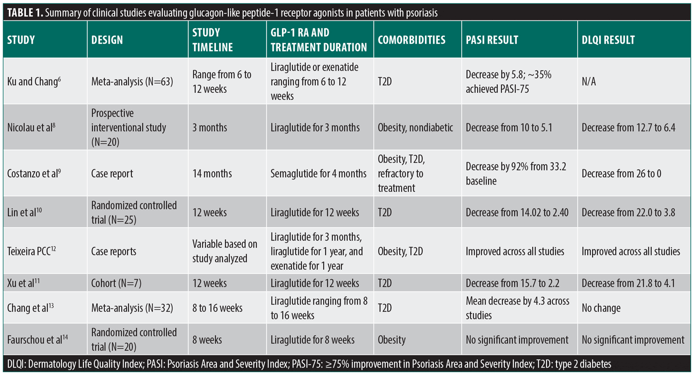 Limitations. Although GLP-1 RAs have garnered interest for the treatment of immune-mediated skin conditions such as psoriasis, there are notable limitations in the current literature. Many of the studies available are case reports or clinical trials with small sample sizes or short durations. For instance, a randomized placebo-controlled trial conducted by Faurschou et al14 examined the effect of liraglutide on psoriasis in glucose-tolerant patients. This study followed 20 patients over an 8-week treatment period. Nonetheless, this study demonstrated that liraglutide did not significantly change PASI and DLQI in these patients when compared with placebo. However, such results must be interpreted cautiously, as the small sample size and short study durations preclude comment on the long-term effects and safety of GLP-1 RAs in the treatment of psoriasis, ultimately limiting the ability to draw definitive, robust conclusions.