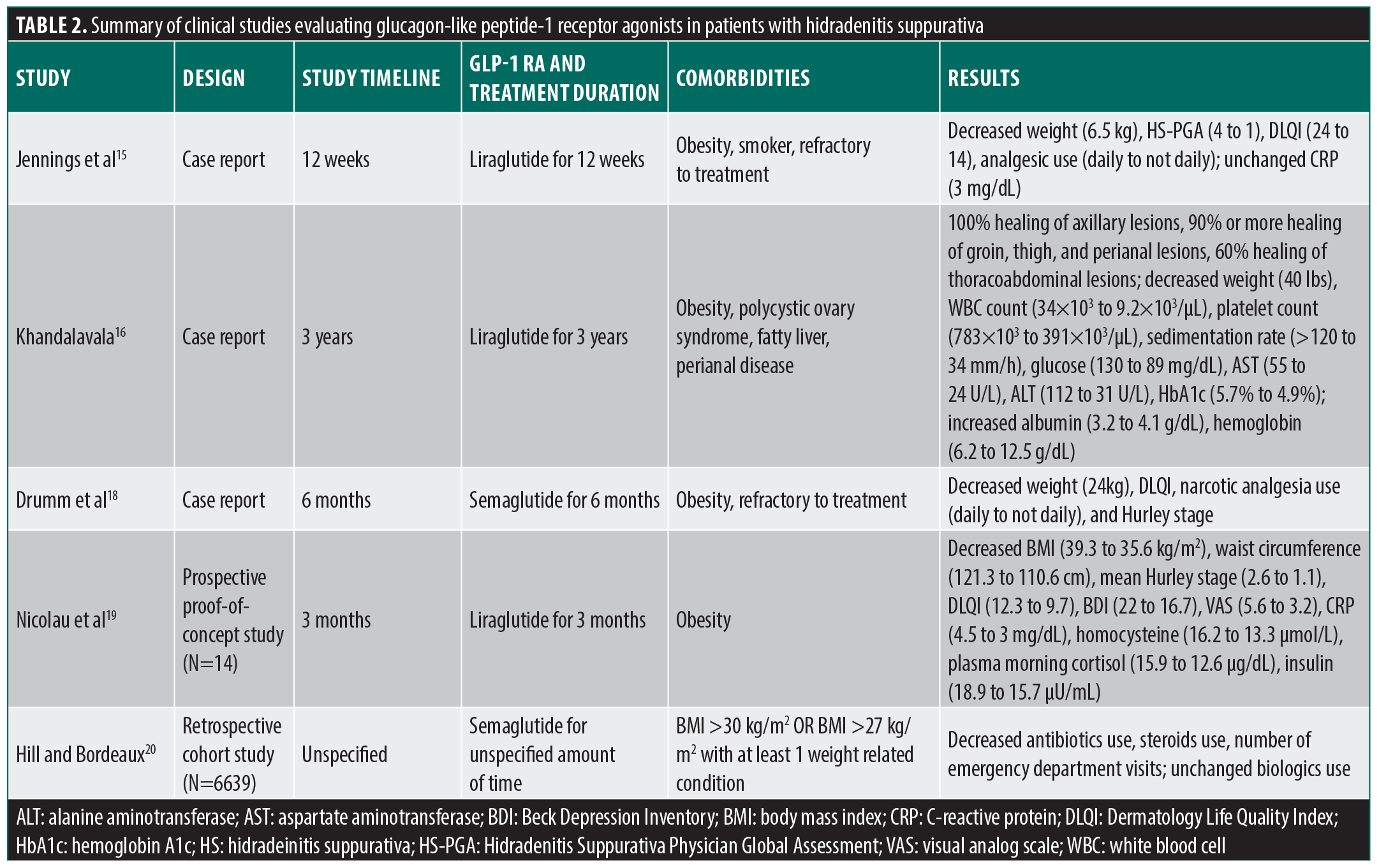Evidence summary. GLP-1 RAs, particularly liraglutide and semaglutide, have been shown to have a generally positive effect in the treatment of HS. These medications are approved by the Food and Drug Administration (FDA) and are typically prescribed to patients with either a BMI greater than 30 kg/m2 (obese) or a BMI greater than 27 kg/m2 with a weight-related comorbidity as adjuncts to lifestyle modifications.3 Table 2 highlights the results of the use of GLP-1 RAs in treating HS from multiple case reports, a prospective proof-of-concept study, and a retrospective cohort study. The overall results show that GLP-1 RAs were successful in decreasing BMI, lesion severity and presence, and inflammatory markers while also increasing quality of life. Both case reports regarding the first uses of liraglutide in treating HS revealed a significant decrease in lesion severity and presence.15,16 Jennings et al15 demonstrated a significant decrease in weight (6.5 kg), HS Physician’s Global Assessment (HS-PGA) (from 4 to 1), DLQI (from 24 to 14), and analgesic use (from daily to not daily) but no decrease in CRP (from 3 mg/dL) after eight weeks of treatment. Khandalavala16 showed 100% healing of axillary lesions, 90% or more healing of groin, thigh, and perianal lesions, and 60% healing of thoracoabdominal lesions. There was also a decrease in weight (40 lbs), white blood cell (WBC) count (from 34×103 to 9.2×103/µL), platelet count (from 783×103 to 391×103/µL), sedimentation rate (from >120 to 34 mm/h), glucose (from 130 to 89 mg/dL), aspartate aminotransferase (AST) (from 55 to 24 U/L), alanine aminotransferase (ALT) (from 112 to 31 U/L), and HbA1c (from 5.7% to 4.9%), as well as an increase in albumin (from 3.2 to 4.1 g/dL) and hemoglobin (from 6.2 to 12.5 g/dL) after three years of treatment.15-17 The first case report documenting the successful use of semaglutide in treating HS by Drumm et al18 also showed a reduction in weight (24 kg), DLQI, narcotic analgesia use (from daily to not daily), and Hurley stage after six months of treatment. A prospective proof-of-concept study by Nicolau et al19 found that liraglutide treatment for three months resulted in a decrease in BMI (from 39.3 to 35.6 kg/m2), waist circumference (from 121.3 to 110.6 cm), mean Hurley stage (from 2.6 to 1.1), DLQI (from 12.3 to 9.7), Beck Depression Inventory (BDI) (from 22 to 16.7), and visual analog scale (VAS) for pain (from 5.6 to 3.2), as well as a decrease in inflammatory markers such as CRP (from 4.5 to 3 mg/dL), homocysteine (from 16.2 to 13.3 µmol/L), plasma morning cortisol (from 15.9 to 12.6 µg/dL), and insulin (from 18.9 to 15.7 µU/mL). Lastly, a retrospective cohort study by Hill and Bordeaux20 showed reduced HS resource utilization (HSRU), including decreased use of antibiotics and corticosteroids and the number of emergency department visits, but no change in the use of biologics after semaglutide treatment for an unspecified amount of time. Therefore, the literature suggests that GLP-1 RAs are effective in managing associated obesity, lesions, and inflammation in patients with HS, resulting in an improved quality of life.